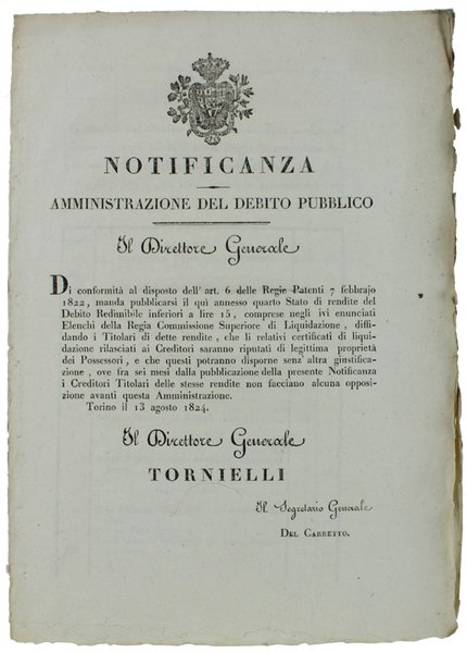 NOTIFICANZA. AMMINISTRAZIONE DEL DEBITO PUBBLICO. Il Direttore Generale. manda pubblicarsi il qui annesso quarto Stato di rendite del Debito Redimibile inferiori a lire 15… Torino il 13 agosto 1824 [documento originale]. | Libri antichi e moderni | Carlo Felice Di Savoia.