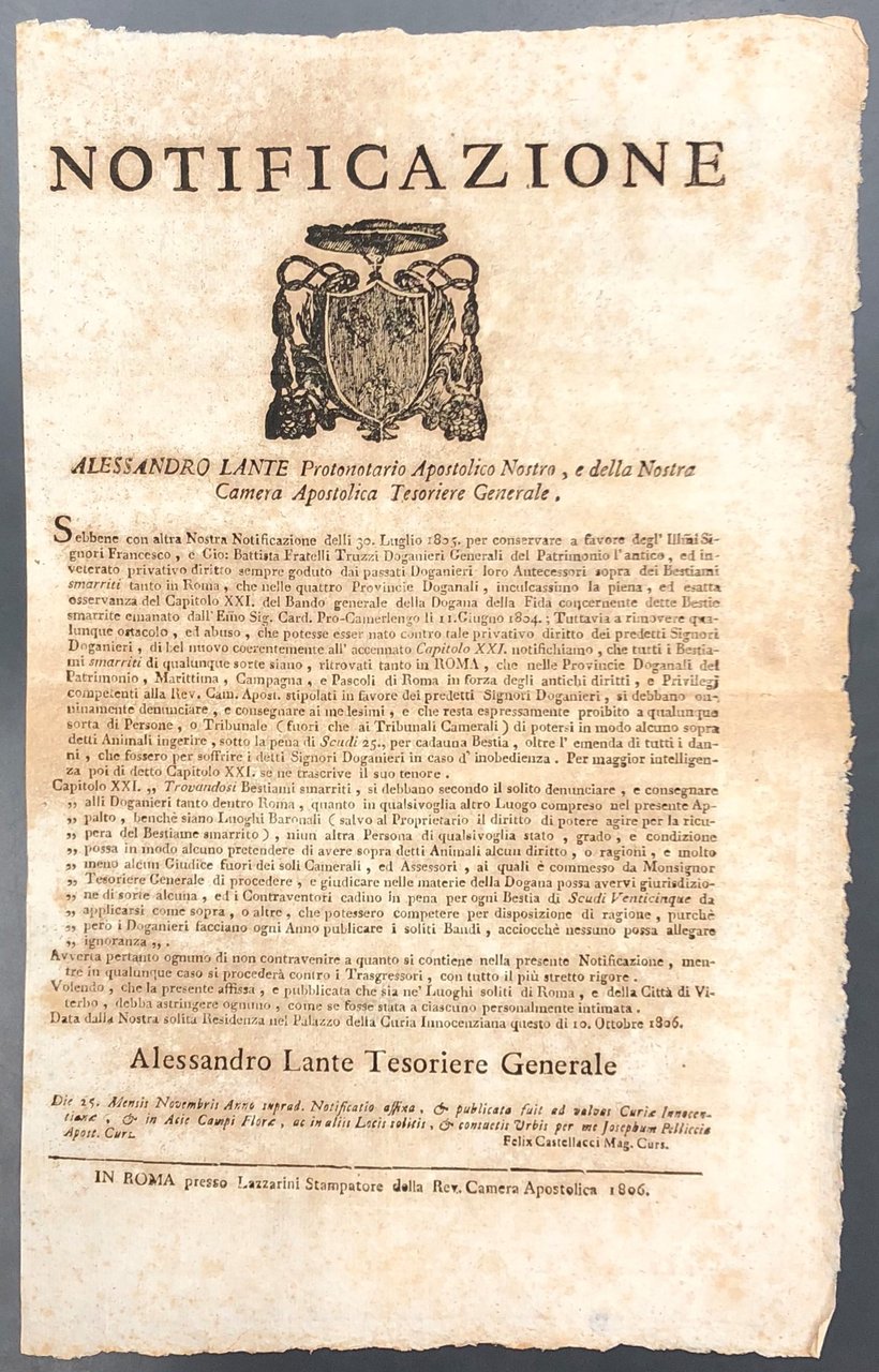 Notificazione. Divieto di appropiarsi del bestiame smarrito da riconsegnare ai doganieri, pena una multa di 25 scudi per ogni animale non denunciato | Libri antichi e moderni | Stato Pontificio - Pio Vii - Lante