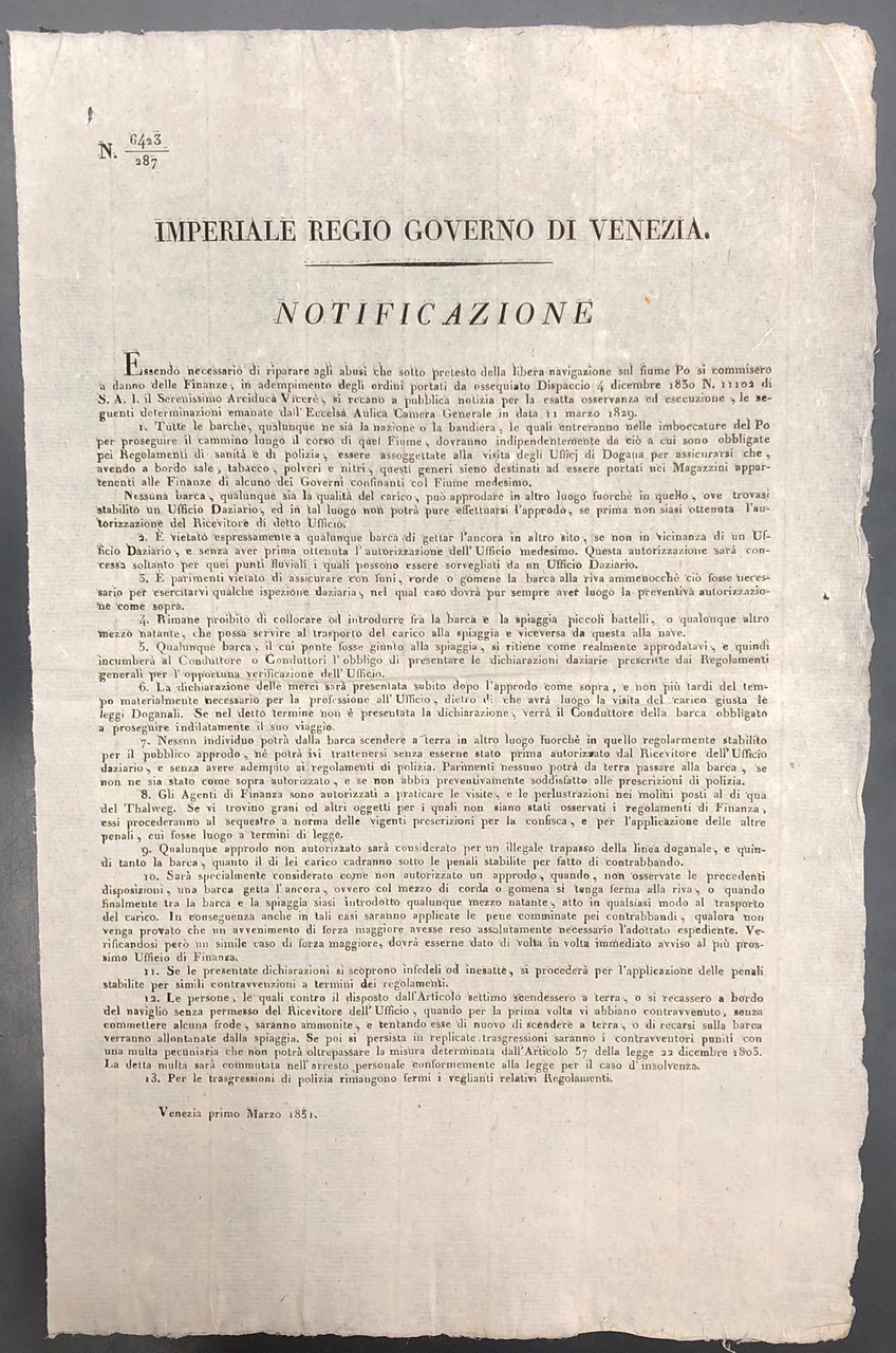 Notificazione. Imperiale Regio Governo di Venezia. Decreti per porre fine agli abusi commessi durante la navigazione del Po a danno delle finanze del Regno | Libri antichi e moderni | Imperiale Regio Governo Di Venezia