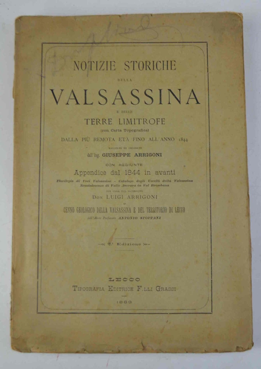Notizie storiche della Valsassina e delle terre limitrofe... Con aggiunte. Appendice dal 1844 in avanti. Florilegio di Voci Valsassine - Catalogo degli Uccelli della Valsassina - Reminiscenze di Valle Averara in Val Brembana... e cenno geologico della Valsassina e del territorio di Lecco dell'Abate Professore Antonio Stoppani. Seconda edizione.