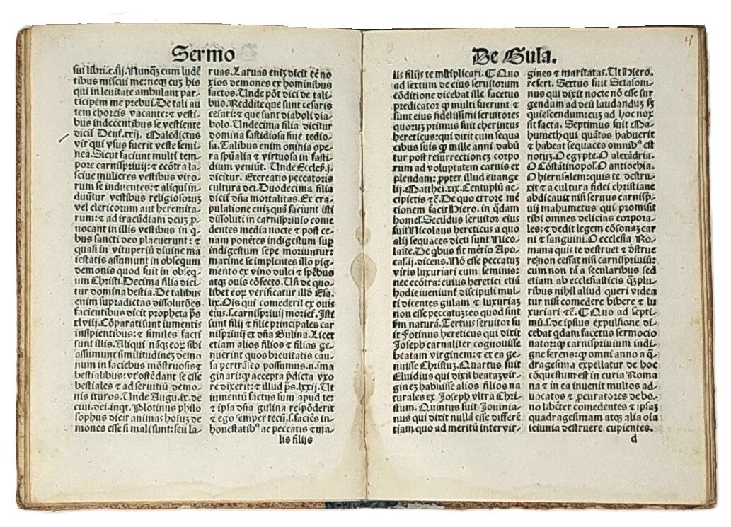 >in-8 piccolo (152x107 mm), ff. 30 (segnatura: a-f 8, g6), carattere gotico su due colonne. Legatura in cartone maculato di fine XVIII secolo (con minime mancanze). Piccola raccolta di sermoni quaresimali, di cui è nota un'edizione precedente (Venezia 1505), ad opera del domenicano inglese Robert Holkot (o Holcot, ca. 1290 - 1349), noto filosofo ed esegeta biblico, professore di teologia a Oxford e seguace della scolastica di Guglielmo di Ockham. Comprende i commenti ai peccati capitali: tra i sette, alla gola è dedicato un sermone di gran lunga più esteso rispetto agli altri. La data si ricava dalle notizie sull'attività del tipografo, infatti dopo il 1528 le sue edizioni sono tutte sottoscritte "B. Benali e compagni". Raro, censito in sole tre biblioteche italiane (Fabriano, Archiginnasio e Vallicelliana). Buon esemplare, minima gora d'umido al margine interno e inferiore, altrimenti piuttosto fresco. Dizionario biografico degli italiani, vol. 8 (B. Benali). Non in Adams.