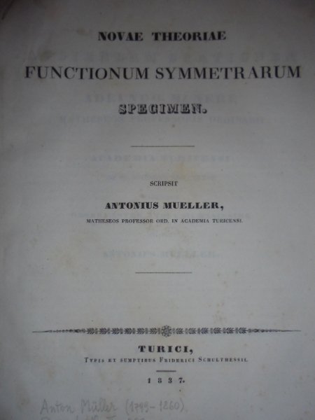 Anton Müller (1799 - 1860). Turici, Typis et sumptibus Friderici Schulthessil, 1837. NOVAE THEORIAE Functionum Symmetrarum specimen. In - 8° grande, cop. muta recente. 20 pp. Antonius Mueller, matheseos professor ord. in Academia Turicensi. Opuscolo ben conservato. Neg. sotto esot.