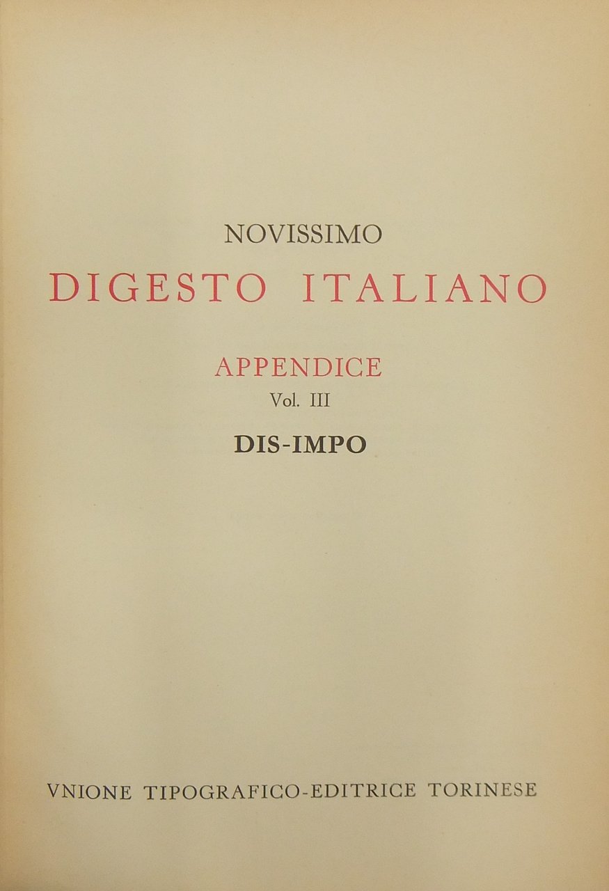 Novissimo Digesto Italiano. Diretto da Antonio Azara e Ernesto Eula. Appendice III: DIS-IMPO | Libri antichi e moderni | Autori Vari