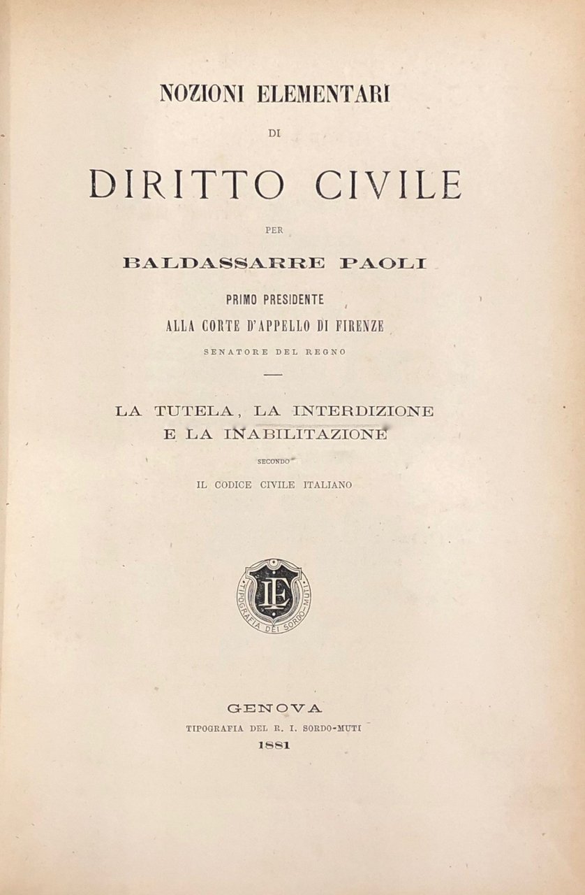 Nozioni elementari di diritto civile. La tutela la interdizione e la inabilitazione secondo il Codice Civile italiano | Libri antichi e moderni | Paoli Baldassarre