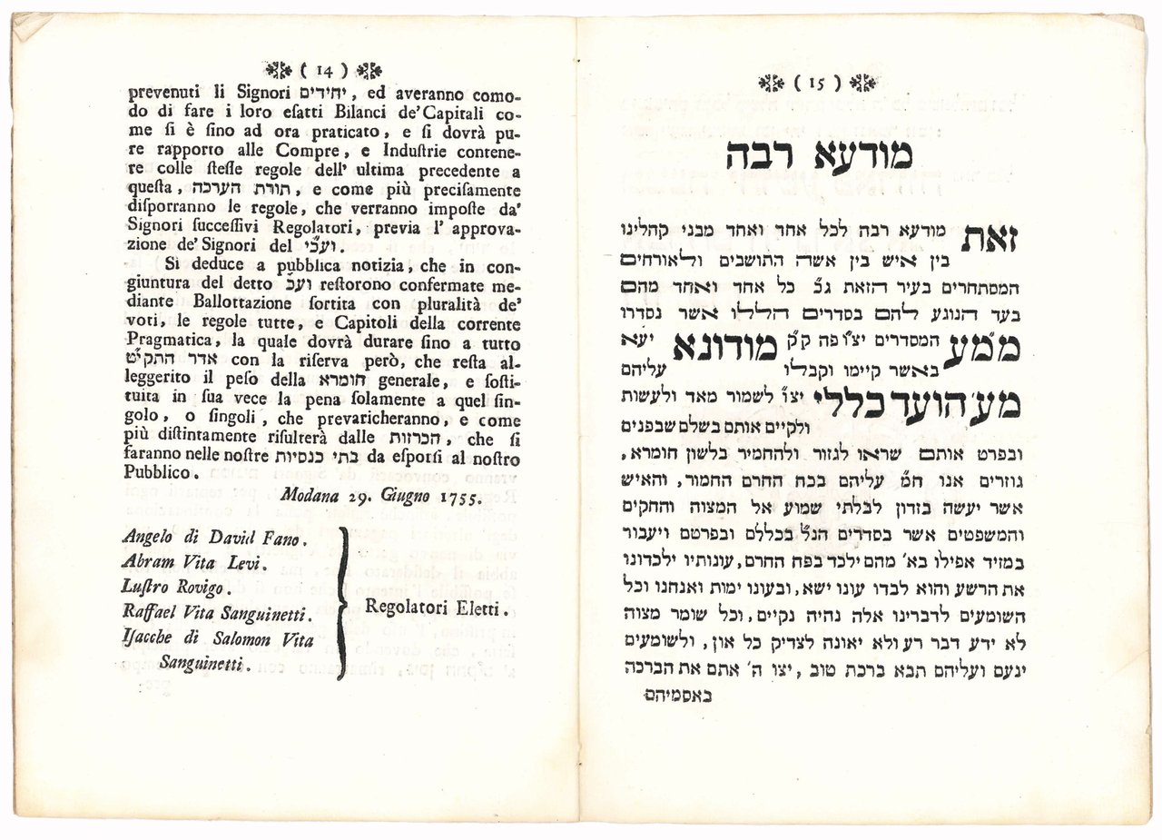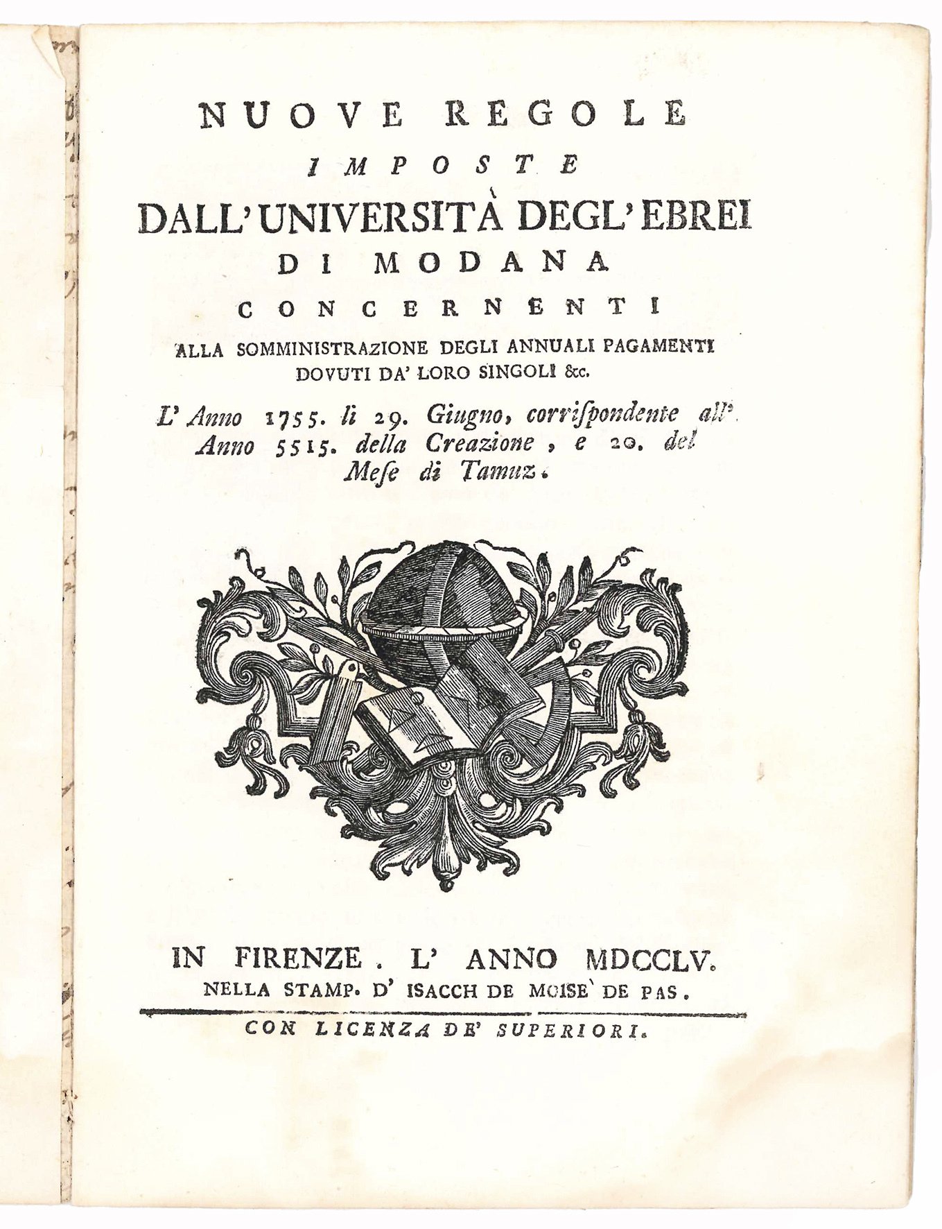 Nuove regole imposte dall'Università degl'Ebrei di Modana concernenti alla somministrazione degli annuali pagamenti dovuti da' loro singoli &cc. L'anno 1755. li 29. Giugno, corrispondente all'anno 5515 della Creazione, e 20. del Mese di Tamuz