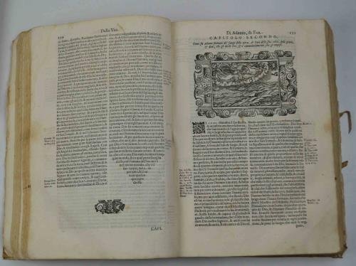 Cm. 32, pp. (28) 678. Frontespizio in rosso e nero con marchio tipografico, incisioni xilografiche all'inizio di ogni capitolo. Legatura coeva in pergamena floscia con titolo manoscritto al dorso. Tracce d'usura alla legatura (che risulta un po' stropicciata), una gora chiara all'angolo alto delle prime carte, qualche macchietta ed arrossatura sparsa. Complessivamente esemplare genuino ed in discreto stato di conservazione. gora al frontespizio e all'angolo superiore destro delle carte, arrossature. Le xilografie che presentano nudità femminili (Eva, Susanna, etc.) censurate con macchie di inchiostro.