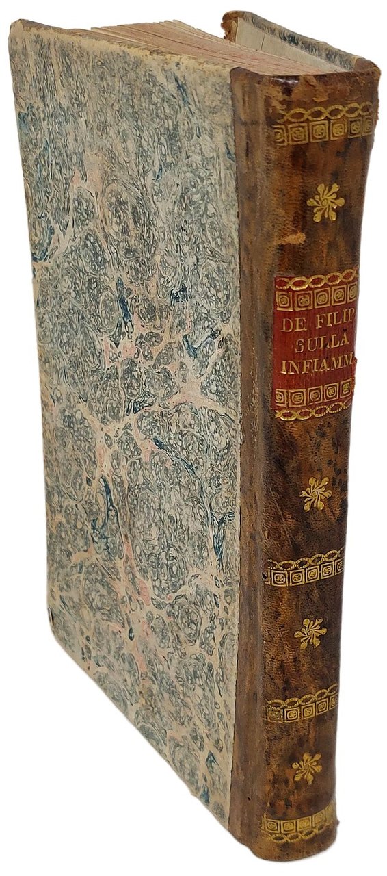 >in-8, pp. XVII, 176. Legatura coeva mezza pelle e angoli, titolo oro su tassello al dorso. Interessante monografia dedicata alle flogosi, oltre analizzare tutti i processi infiammatori (suppurazione, induramento, atrofia, cangrena...) tratta dei metodi antiflogistici (autossia cadaverica, polso, dolore, cotenna, tolleranza de' rinedii...) dei corollari pratici e terapeutici (cura esterna, topici freddi ed astringenti, caldi, mollitivi, stimolanti, sgorgamenti vascolari), delle cure interne etc. Bell'esemplare con qualche leggera marginale fioritura, più marcate al primo e all'ultimo foglio.