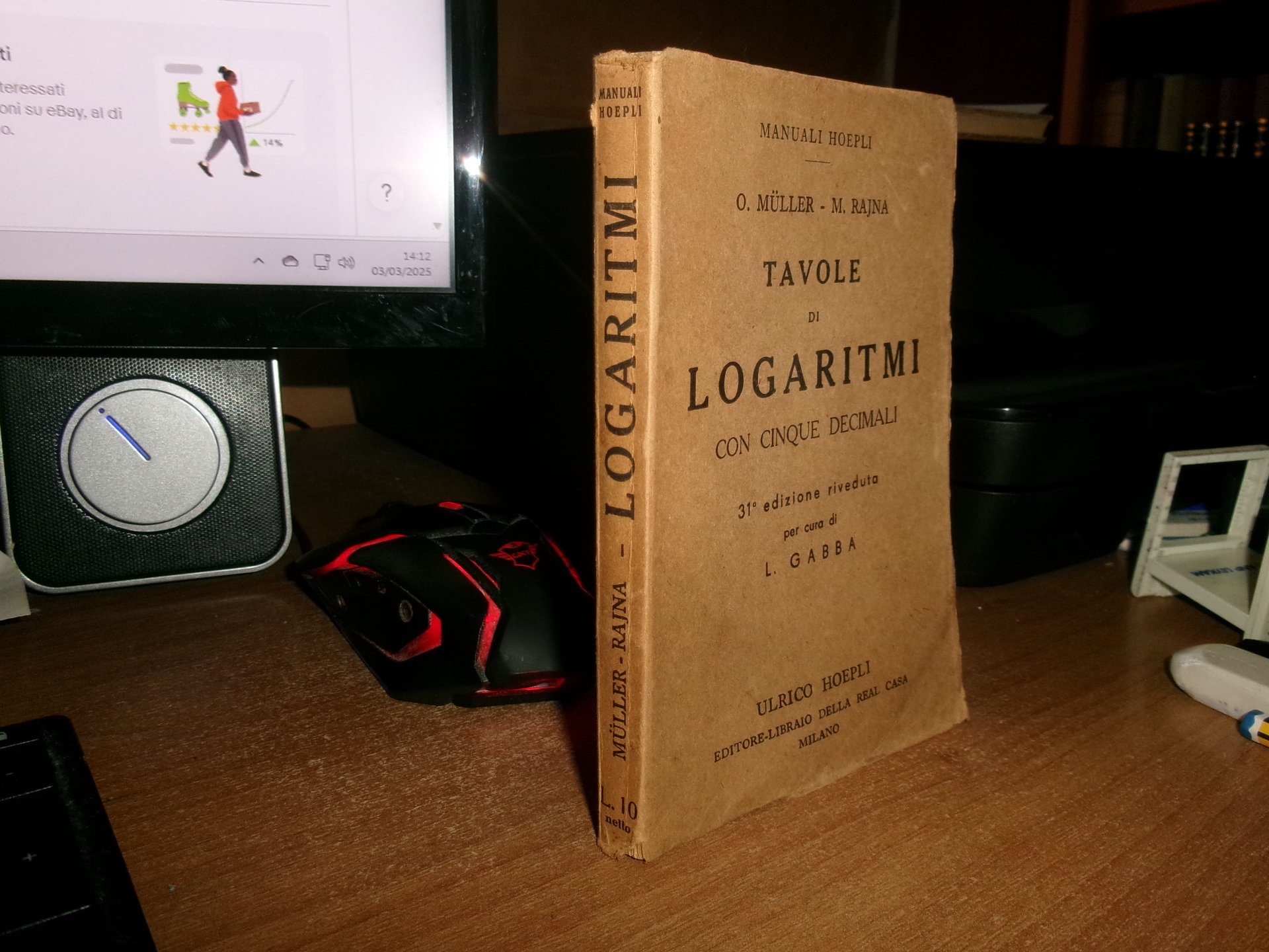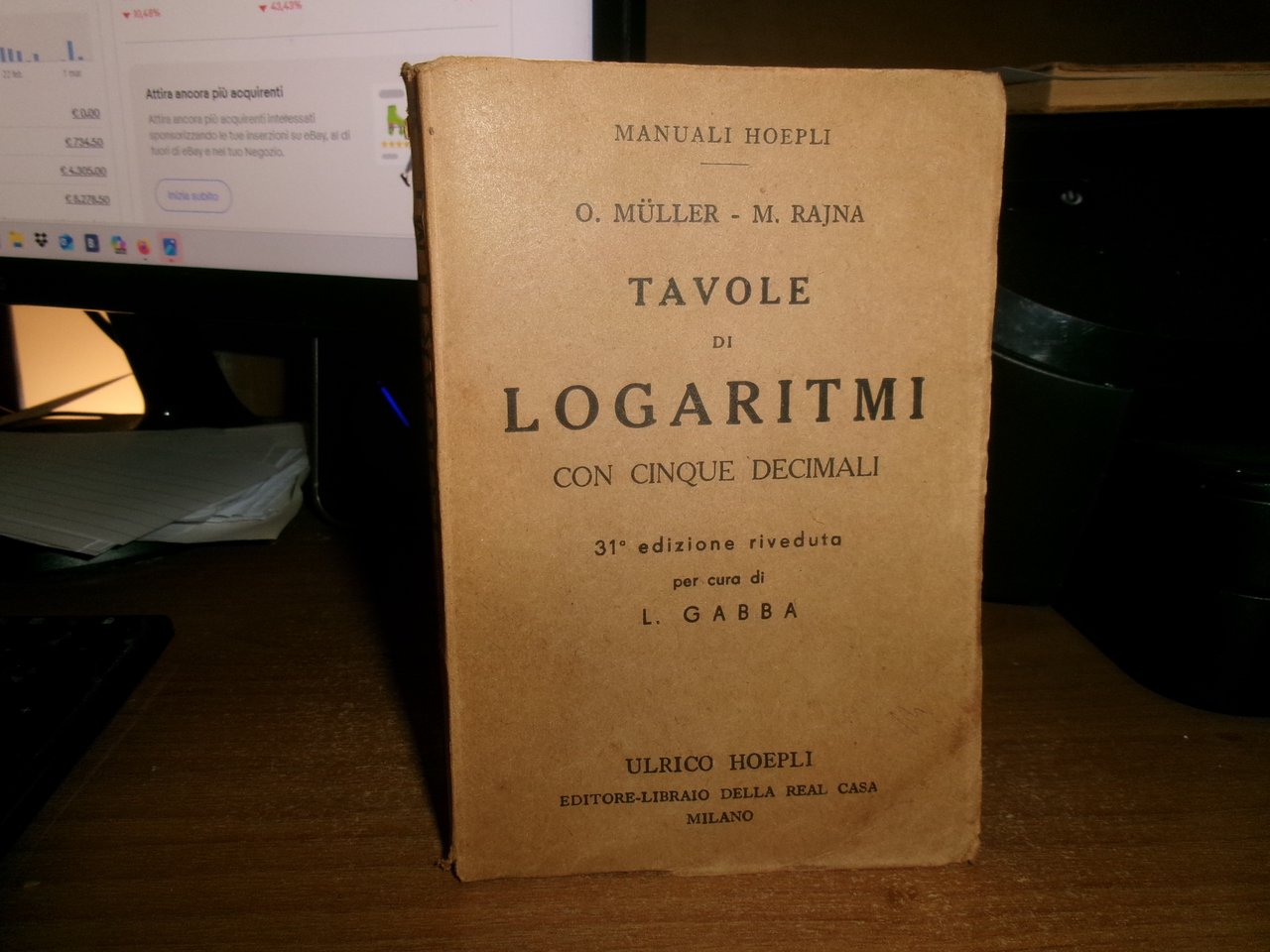O. MULLER - M. RAJNA. Tavole di LOGARITMI con cinque decimali. 31a edizione riveduta per cura di L. Gabba. Milano, Ulrico Hoepli, 1943. In-16°, br. orig. xxxii, 203 pp. Ben conservato. Neg. scat. ultimi Hoepli.