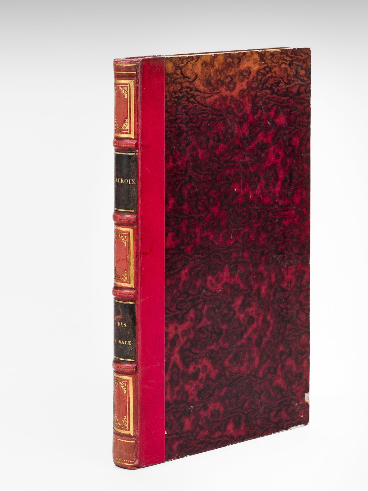 1 vol. in-8 reliure de l'époque demi-veau cerise, dos à 4 nerfs, Dezobry, E. Magdeleine et Cie, Paris, 1848, VIII-167 pp. Rare exemplaire de cette traduction d'Horace par Jules Lacroix (1809-1887), le frère de Paul Lacroix. Etat très satisfaisant (coupes frottées, bon état par ailleurs, ex-libris héraldique Laharraga, de la bibliothèque Robert Braün à Guéthary).