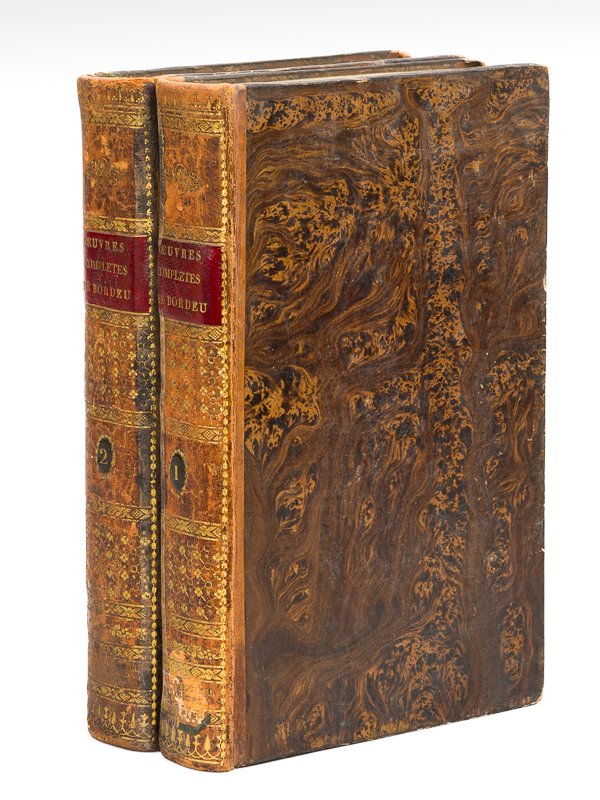 2 vol. in-8 reliure demi-basane marron, Chez Caille et Ravier, Paris, 1818, XXIV-484 ; IV pp. ; pp. 485-1044 Médecin et philosophe, théoricien du vitalisme, Théophile de Bordeu (1722-1776) naît à Izeste dans la Vallée d'Ossau et meurt à Bagnères-de-Bigorre. Médecin de Madame du Barry et ami de Diderot, sa maîtrise de la langue d'oc fit de lui l'un des grands poètes du Béarn. Le présent recueil contient uniquement les oeuvres médicales, dont ses "Recherches sur l'Histoire de la Médecine". Etat très satisfaisant (dos frottés, bon état par ailleurs).