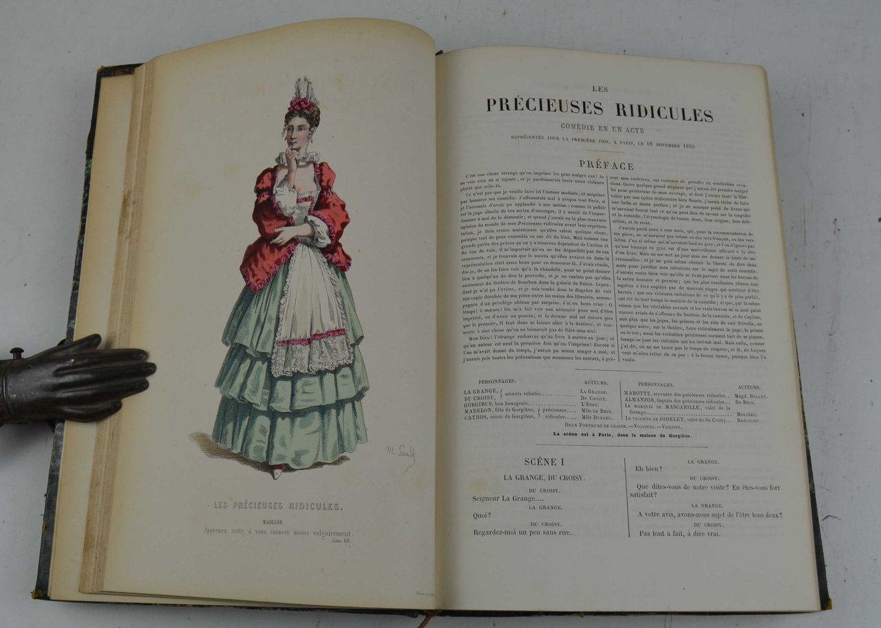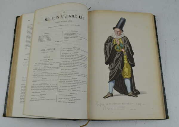 Cm. 26,5, pp. (4) xv, 649 (3). Con 20 belle tavole fuori testo incise in rame e finemente colorate raffiguranti i principali personaggi delle opere di Molière. Legatura coeva in mezza pelle, dorso a nervi con titoli e fregi in oro. Qualche spellatura alla legatura, peraltro bell'esemplare, a carte candide. Le tavole sono opera di Geffroy e Maurice Sand ed alcune di queste appaiono per la prima volta in quest'opera.