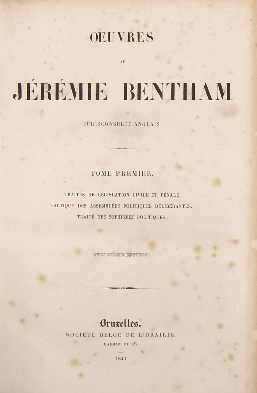 Oeuvres. Vol. I - Traites de legislation civile et penale. Tactique des assemblees politiques deliberantes. Traite des sophismes politiques | Libri antichi e moderni | Bentham Jeremy (1748-1832)