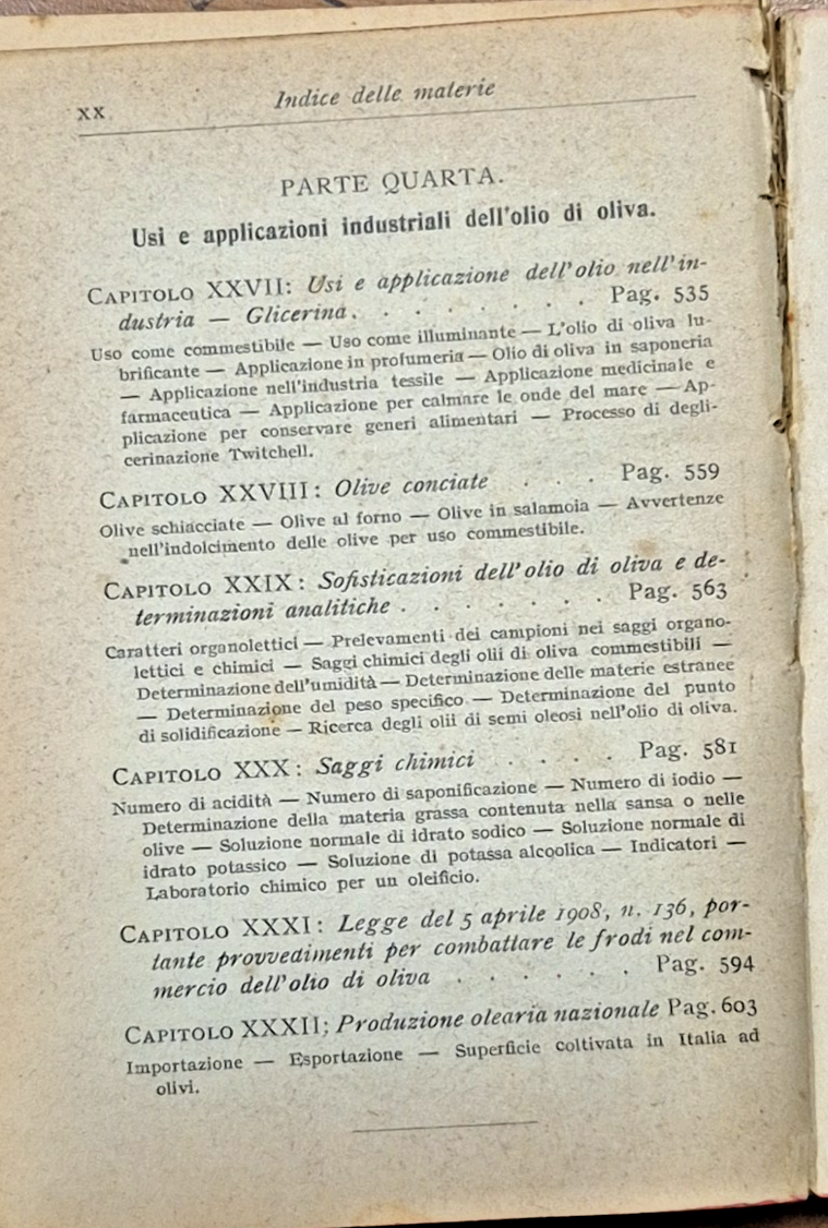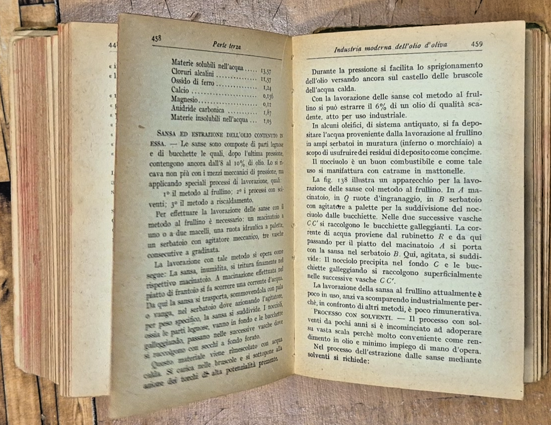 OLIVICOLTURA ED OLEIFICIO MODERNO di Rosario F. Simari, Seconda edizione completamente rifatta Ulrico Hoepli Editore, 1923. 624 pagine. 162 Illustrazioni in bianco e nero nel testo. Copertina editoriale in tutta tela. Stato di conservazione: buono (pagine ingiallite, copertina sciupata con dorso completamente mancante e sostituito da fettuccia di carta e altre piccole mancanze ai piatti, strappi all'ultima pagina dell'indice).