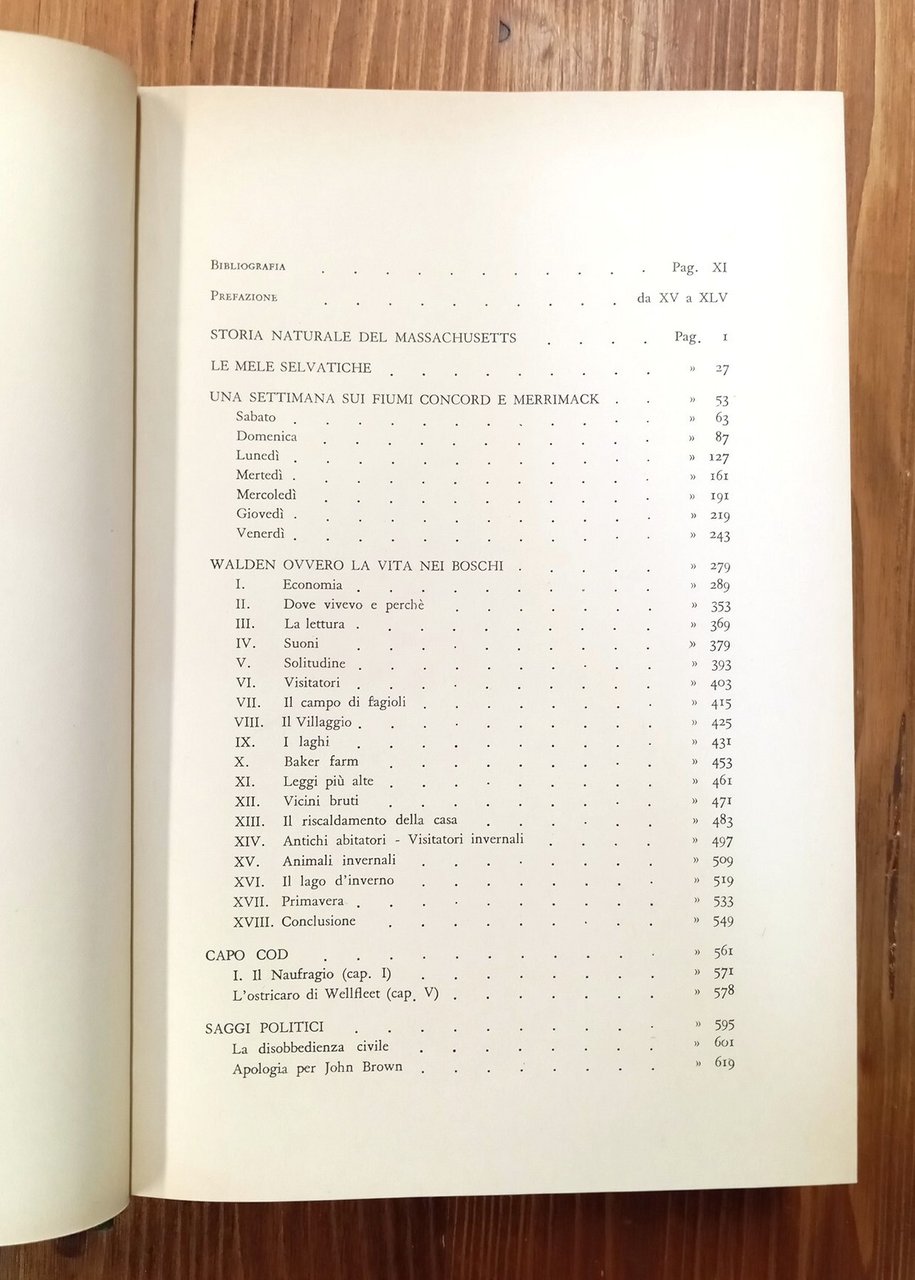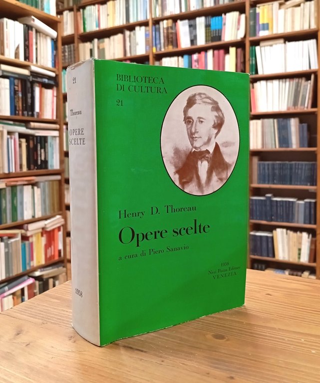 Collana "Biblioteca di cultura", 21 - Volume rilegato in tela editoriale verde con sovraccoperta figurata, xlv-642 pagine con alcune tavole in nero intercalate. Testi a cura di Piero Sanavio. Contiene: Storia naturale del Massachusetts; Le mele selvatiche; Una settimana sui fiumi Concord e Merrimack; Walden ovvero la vita nei boschi; Capo Cod; Saggi politici. Indice dettagliato consultabile nelle nostre immagini. Lievi segni d'uso e del tempo, nel complesso ottimo esemplare dalla paginazione fresca e compatta; edizione non comune.