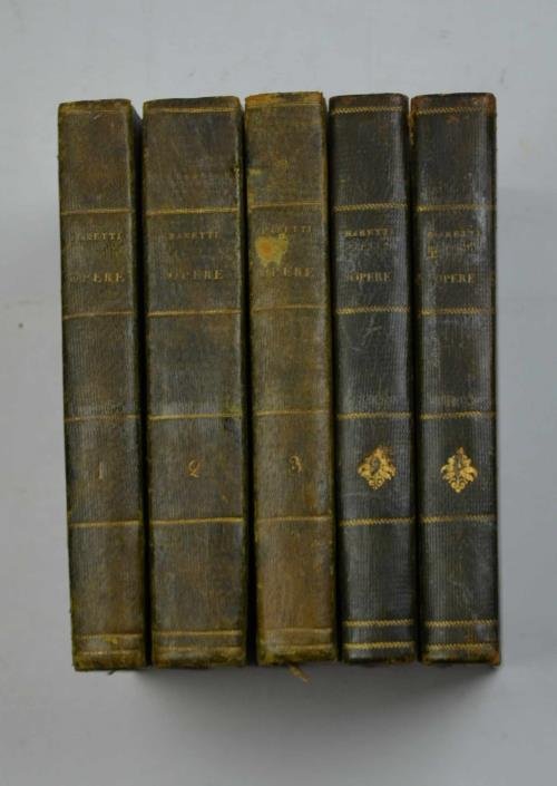 Tre volumi di pp. (4) 332; 438; 363 (1). Unito a: BARETTI G. Scritti scelti inediti e rari. Milano, Bianchi, 1822-23. Due volumi di pp. 410; 407 (1). Con bel ritratto del Baretti all'acquatinta all'antiporta del primo volume. In totale cinque volumi di cm. 21, solida legatura del tempo in mezza pelle verde. Una piccola lacuna ad un dorso, peraltro esemplare ben conservato. I primi tre volumi comprendono l'intero testo della Frusta letteraria.