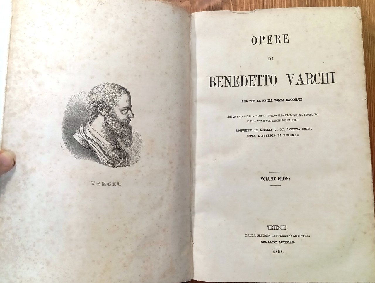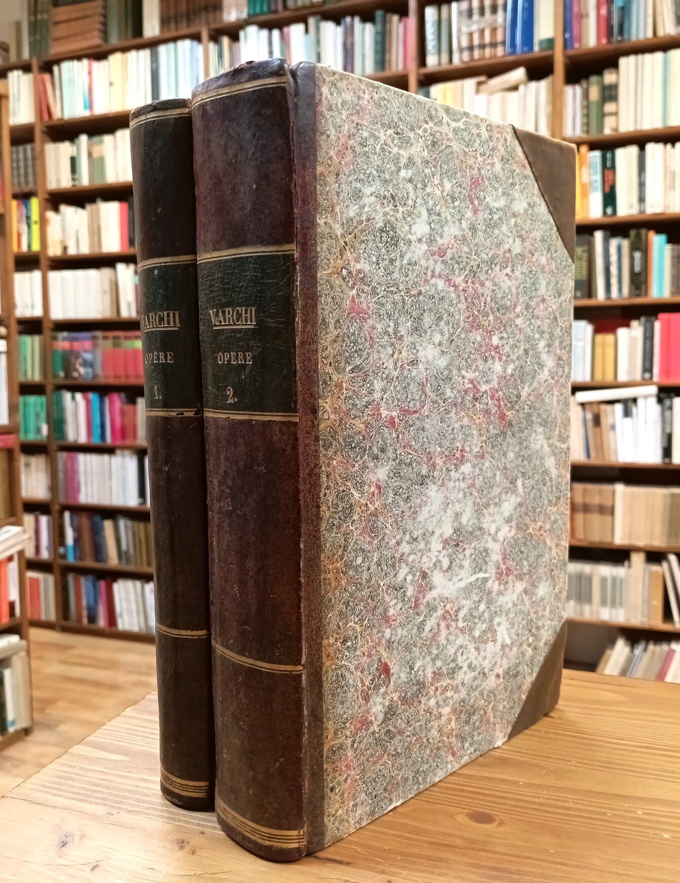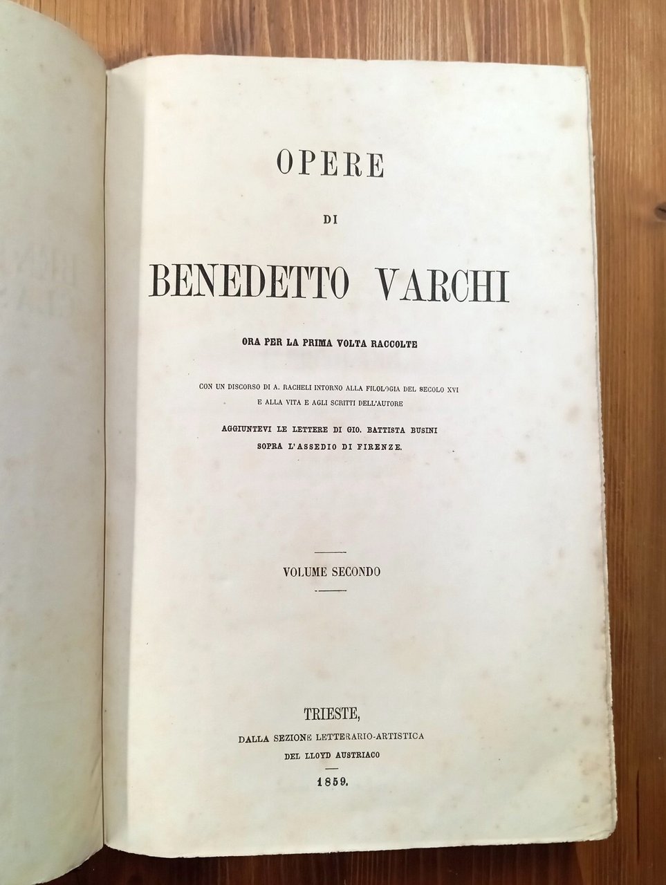 "Biblioteca classica italiana. Secolo XVI", n. 6 - Opera di due volumi di medio formato (28,5 cm) rilegati uniforme copertina rigida coeva con dorso e angoli in pelle marrone, titolo in oro su tasselli applicato al dorsi, 626 + 1029 pagine. Ritratto dell'autore inciso all'antiporta del primo volume. Testi stampati su due colonne. "Con un discorso di A. Racheli intorno alla filologia del secolo XVI e alla vita e agli scritti dell'autore; aggiuntevi le lettere di Gio. Battista Busini sopra l'assedio di Firenze". Ordinarie, leggere fioriture, peraltro esemplari integri e ben conservati.