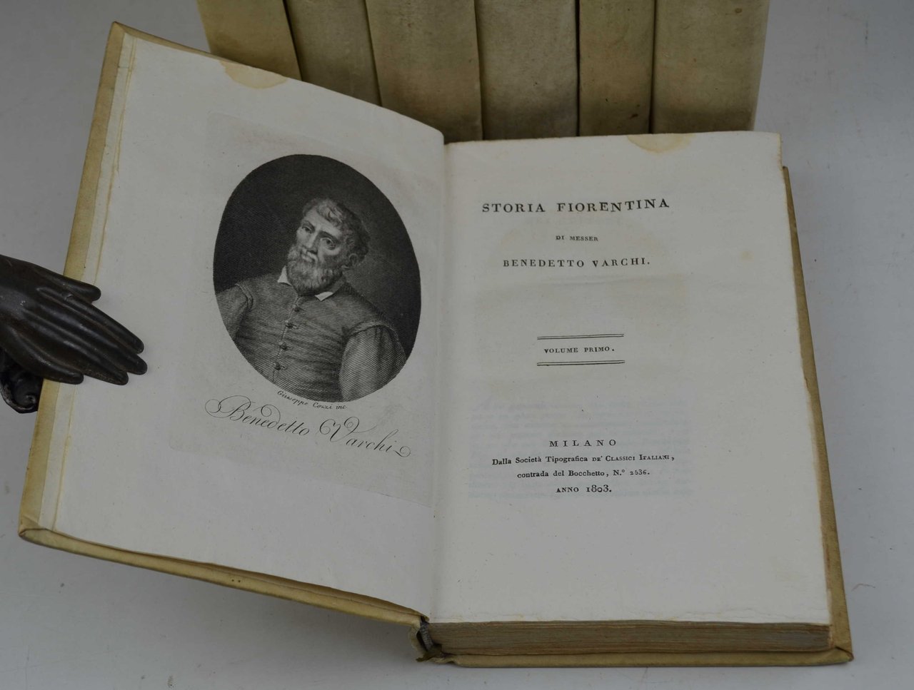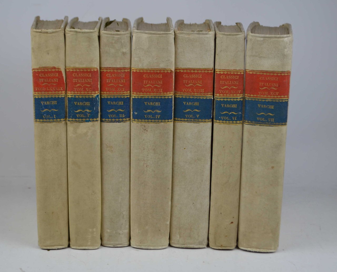 Sette volumi di cm. 22,5, pp. oltre 2.000 complessive. Con un ritratto dell'autore ed una tavola ripiegata fuori testo. Solida ed elegante legatura coeva in piena pergamena rigida, dorsi lisci con titoli in oro su doppio tassello bicolore. Esemplare particolarmente marginoso (in barbe), genuino ed in ottimo stato di conservazione. Ex libris nobiliare inglese. Contiene: "Storia fiorentina" (in cinque volumi) - "L'Ercolano", Dialogo nel quale si ragiona delle lingue, ed in particolare della toscana e della fiorentina (in due volumi). Cfr. Gamba (998 per le Istorie Fiorentine): "materiale ristampa della prima ediz. della Storia fiorentina, 1721, in cui però non si omise la narrazione della scelleratezza di Pierluigi Farnese" - Gamba (1002 per "L'Ercolano"): "materiale ristampa della pregevoliss. ediz. di Padova, Comino, 1744".