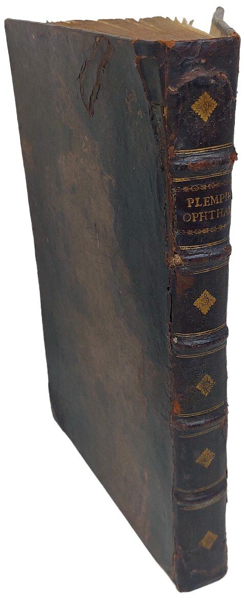 >in-folio (mm 300x293), ff. (2), pp. 209, (8, Index), ritratto di Plemp inciso a piena pagina in antiporta,iniziali istoriate, fregi tipografici. Legatura coeva in piena pelle, dorso a nervi con fregi e titolo oro (restauri alle cerniere, piccole mancanze ali piatti). Terza edizione, dopo la prima di Amsterdam 1632 e la seconda di Lovanio 1658, edita in folio per la prima volta e con aggiunta di vari nuovi capitoli sulle malattie dell'occhio. Il trattato non si limita a trattare le malattie dell'occhio ma pure la sua anatomia e la visione. Discreto esemplare (margine esterno dei primi tre fogli restaurato), ex libris"Piergiorgio Borio medico" al contopiatto superiiore.