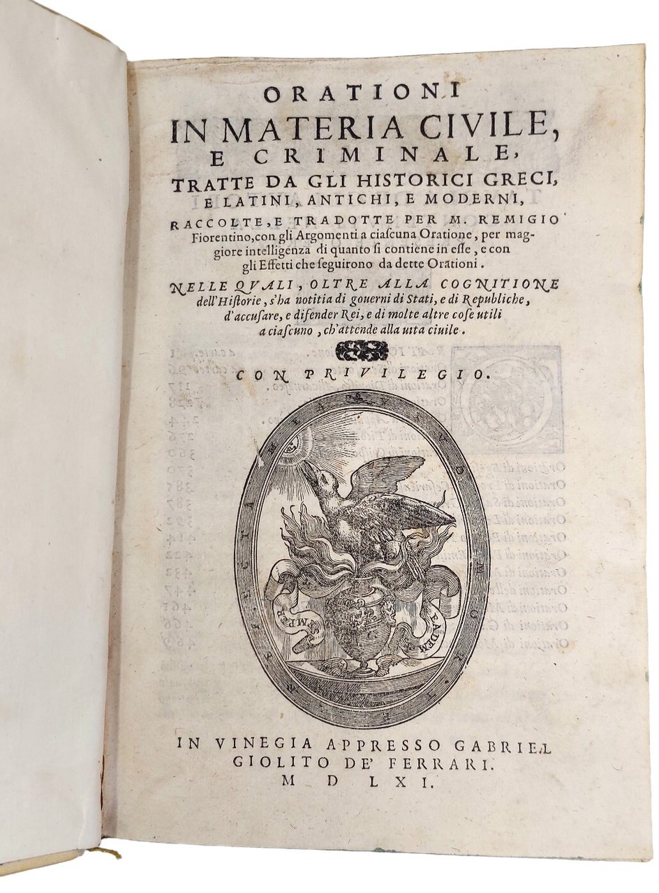 Orationi in materia civile, e criminale, tratte da gli historici greci, e latini, antichi e moderni, racolte e tradotte per M. Remigio Fiorentino, con gli Argomenti a ciascuna Oratione...