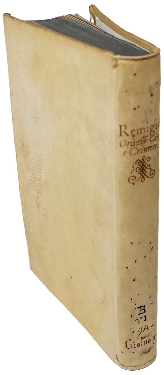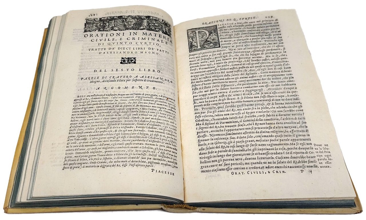 >in-8, (mm 215x140), pp. (16), 483, legatura settecentesca in piena pergamena rigida con unghie e tagli blu, titolo e tipografo elegantemente calligrafati al dorso. Prima edizione di questa raccolta di orazioni di storici latini, greci ed italiani curata da Remigio Nannini. Precede il testo la dedica all'illustre Reverendo S. AntonMaria Salviati. Impresa tipografica al titolo, finalini, testatine e capilettera ornati n.t. Contiene tra le altre le orazioni di: Dione, Senofonte, Quinto Curtio, Appiano Alessandrino, Tito Livio, Crispo Salustio, Egesipio, Procopio Cesariense, Leonardo Aretino, Poggio Fiorentino ed altri. Remigio Nannini o Nanni, conosciuto più comunemente come Remigio Fiorentino (Firenze 1521-1581) visse quasi sempre a Venezia, fu frate domenicano, uomo di profonda cultura, poeta, editore, scrittore politico e traduttore (tra l'altro tradusse i ''Rimedi dell'una e dell'altra fortuna'' di Petrarca e la ''Storia de' costumi de' popoli settentrionali'' di Olao Magno). Esemplare in perfetto stato di conservazione. Al contropiatto anteriore ex-libris inciso tardo settecentesco - con stemma marchionale della panoplia con lo scudo con al centro una stella - della famiglia Dionisi, tra le più antiche della nobiltà di Verona: il marchese Gabriele (1719-1808) fu l'artefice della ristrutturazione della villa a Ca' del lago di Cerea nonché del riordino e aggiornamento della biblioteca. La famiglia Dionisi aveva destinato al piano nobile la funzione di libreria e sala di lettura, precoce esempio di centro culturale dove si riunivano artisti e letterati. Dopo la dispersione delle migliaia di volumi del fondo antico, conserva ora i libri sul mobile d'arte contemporaneo della Fondazione Aldo Morelato. Bongi, Annali di Gabriel Giolito de' Ferrari, II, pp.125-126. Adams, O-242. STC Italian Books, p. 460. Gamba p. 452. Negri, Scrittori Fiorentini, p. 481.