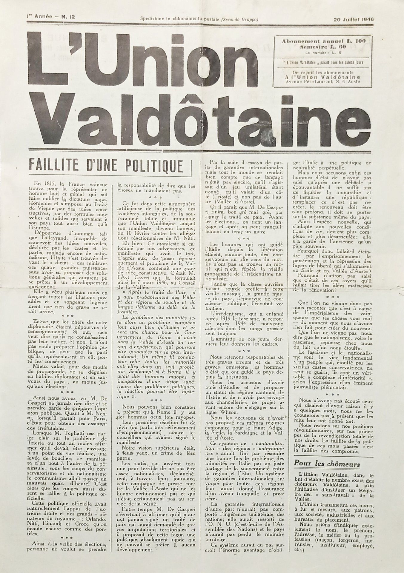 Organe de L'Union Valdôtaine N. 12 - Année I - Faillite d'une politique - 1946