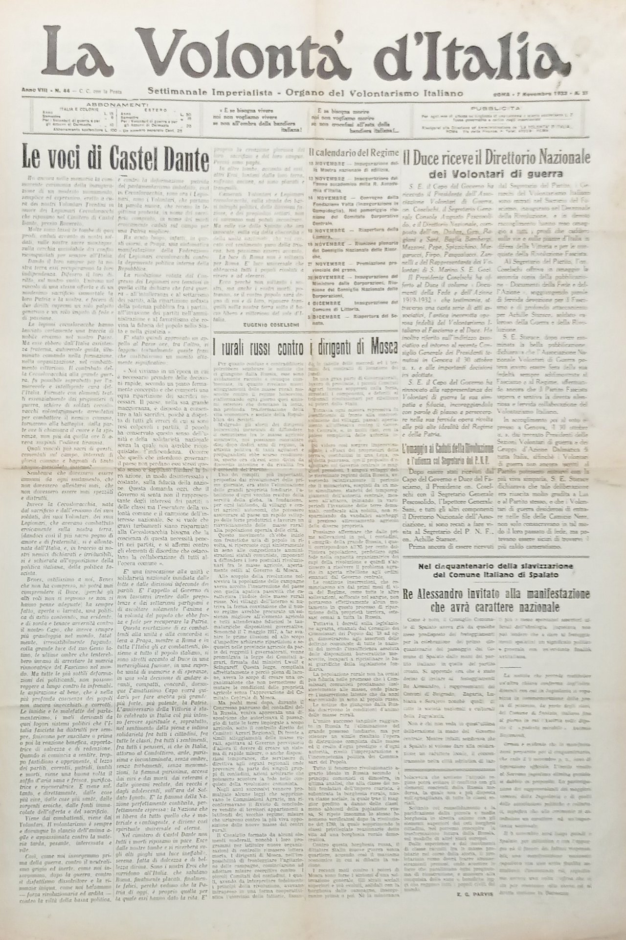 Organo Volontarismo Italiano La Volontà d'Italia N. 44 Voci di Castel Dante 1932