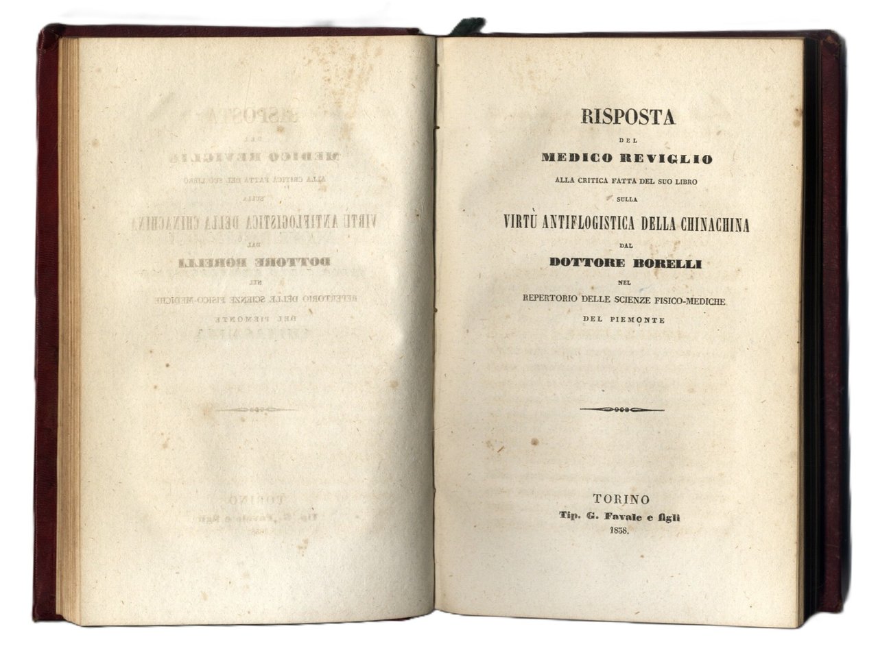 Osservazioni teorico-pratiche sulla virtu antiflogistica della chinachina. [Legato con:] Risposta del medico Reviglio alla critica fatta del suo libro sulla virtu antiflogistica della chinachina dal dottore Borelli nel repertorio delle scienze fisico-mediche del Piemonte. [Legato con:] Conferma della virtu antiflogistica della chinachina del dottore Maurizio Reviglio ... dedotta con nuovi argomenti da' pubblici scritti de' chiarissimi ... | Libri antichi e moderni | REVIGLIO, Maurizio.