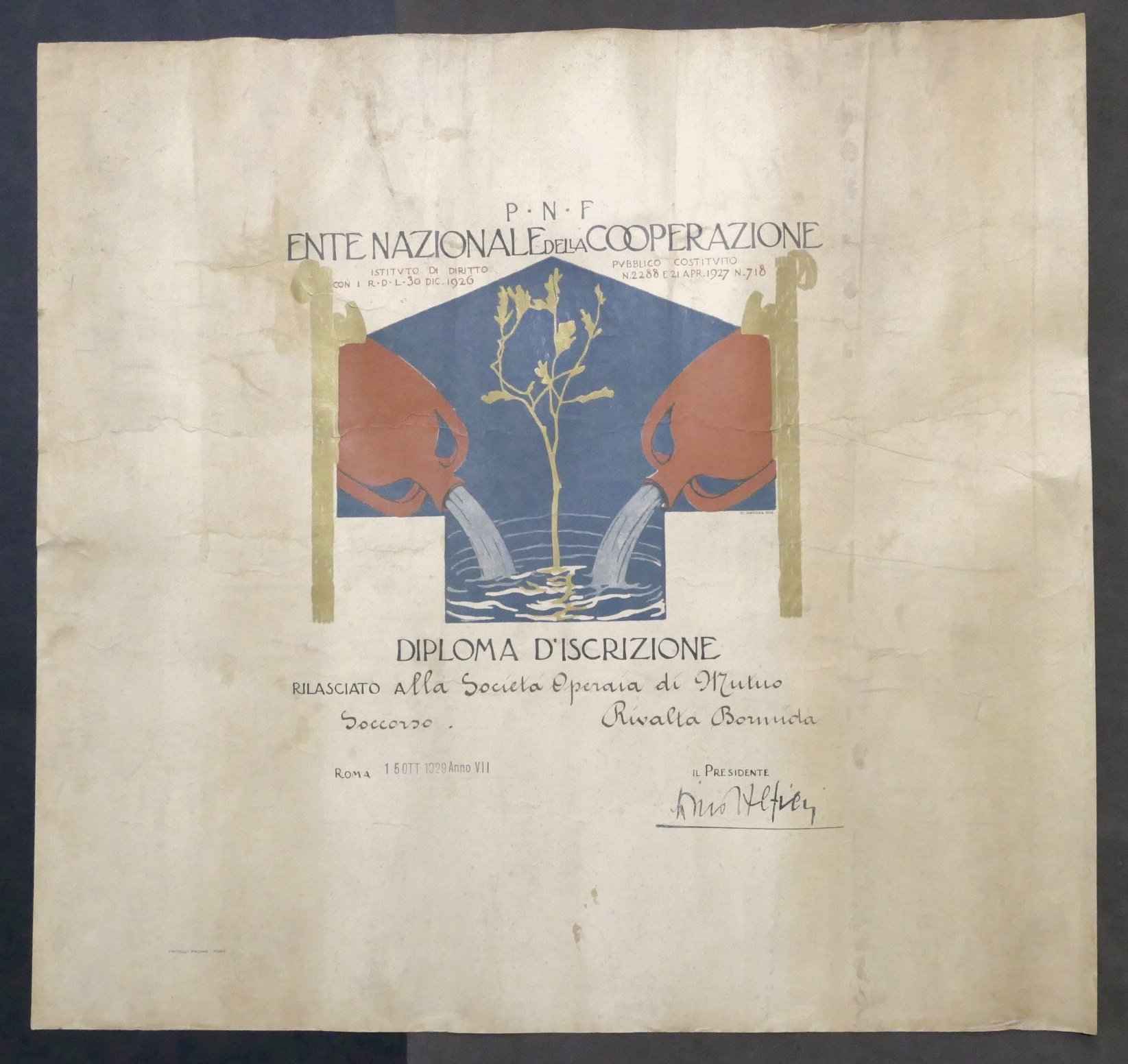 P.N.F. - Ente Nazionale di Cooperazione - Diploma d'iscrizione rilasciato alla Società Operaia di Mutuo Soccorso, Rivalta Bormida - Anno 1929 Dimensioni: 47 x 49 cm ca. Condizioni generali buone. Qualche segno del tempo e alcune pieghe.