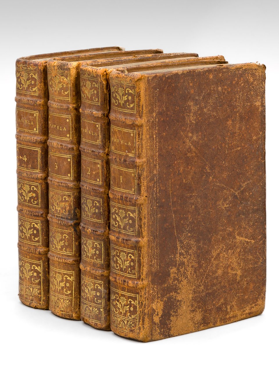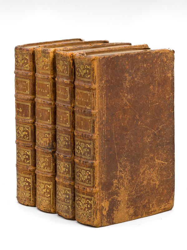 8 tomes en 4 vol. in-12 reliure de l'époque pleine basane marron, dos à 5 nerfs orné, toutes tranches marbrées, Chez la Veuve de Pierre Dumesnil, Labbey, à Rouen, 1782, XXIV-246 pp., 2 ff., 276 pp. ; 2 ff., 267 pp., 2 ff. 262 pp. ; 2 ff., 295 pp., 2 ff., 308 pp. ; 2 ff., 306 pp., 2 ff., 306 pp. et 1 f. n. ch. Rare exemplaire de la traduction complète de la seconde version remaniée du "Pamela" de Richardson, intégrant (à la différence des traductions précédentes) au premier récit celui de sa vie de femme mariée, de ses jalousies et ses longues réflexions sur le "Traité de l'Education" de Locke, qui anticipaient sur l'Emile. Bon état (reliures frottées avec petits mq. en coiffes, coins et coupes frottés, fente à un mors mais reliure bien solide) pour cet exemplaire en reliure d'époque, bien complet, de cette édition rouennaise. On connaît également en 1783 une édition genevoise chez Nouffer de Rodon & Compagnie, et une édition de Liège publiée par Anne-Catherine Bassompierre.