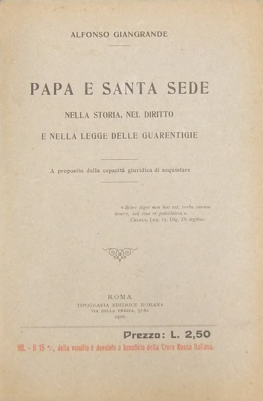 Papa e Santa Sede nella storia nel diritto e nella legge delle guarentigie. A proposito della capacità giuridica di acquistare | Libri antichi e moderni | Giangrande Alfonso