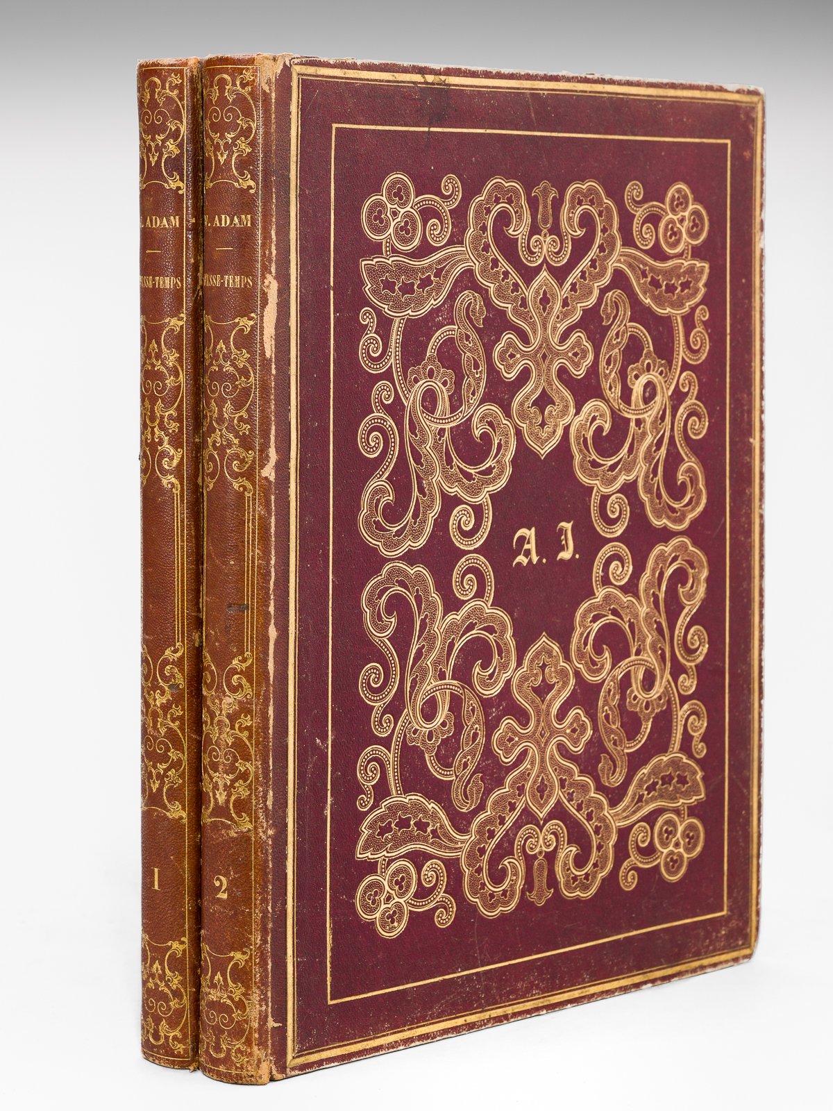 2 vol. in-folio (36 x 27,7 à la reliure, 34,9 x 26,5 cm en marges) reliure de l'époque demi-chagrin brun, dos lisse orné en long, plats richement ornés avec initiales A. J. au centre, Chez Aubert gal-Véro-Dodat, Imp. d'Aubert et de Junca, Paris, s.d. [ circa 1836 - 1840 ], Tome 1 : Planches 1 à 89 ; Tome II : Planches 90 à 180 (les planches 151 à 162 sont dessinées dans le format à l'italienne), Très rare exemplaire dont nous n'avons pas trouvé l'équivalent, contenant 180 planches. Parmi les autres exemplaires les plus complets que nous ayons pu repérer, on peut noter celui du Musée Carnavalet (don Visme de Wegmann), contenant 120 planches et édité par Aumont et Tessari, et un autre exemplaire du même éditeur contenant 124 planches (les éléments disponibles ne permettant pas que l'on puisse conclure avec certitude quant à l'antériorité d'une édition sur l'autre). Comme l'écrit Mennessier de la Lance à propos de Victor Adam (1801-1867), "parmi les milliers de dessins lithographiés dont il est l'auteur, la plupart représentent des chevaux et des scènes hippiques. Il fut donc un spécialiste dans ce genre et son nom mérite de figurer dans une bibliographie hippique. Les chevaux de Victor Adam, qui a représenté toutes les races, du Boulonnais au Pur sang, sont souvent élégants et gracieux et ont parfois un mouvement endiablé [. ]". Dans ce rare recueil de "passe-temps", Victor Adam est fidèle à lui-même et les scènes hippiques abondent (il est rare de trouver une planche sans cheval). On y découvrira également de nombreuses scènes militaires ou de chasse, mais aussi des dessins pittoresques, et parfois exotiques (le recueil s'ouvre d'ailleurs sur des scènes asiatiques). "Tous ses dessins sont exécutés avec une facilité inouïe, "de chic" explique Béraldi, et ils témoignent de la profonde passion de Victor Adam pour la chose équestre. Bon état (des rouss. parfois importantes, reliures un peu frottées, surtout en coupes, 2 petits accrocs marginaux n'affectant pas le dessin, bon exemplaire par ailleurs) pour ce remarquable recueil des "Passe-Tems" rassemblant 180 planches. Mennessier, I, 6 ; Béraldi, Graveurs, I, 15 (à propos de Victor Adam, mais Béralid ne semble pas avoir connu ce recueil).