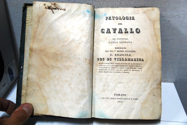 carlo lessona patologia del cavallo 453 pagg opera cpl. prima e seconda pagina ingiallita ma testo cpl. in buone condizioni. 1834 .