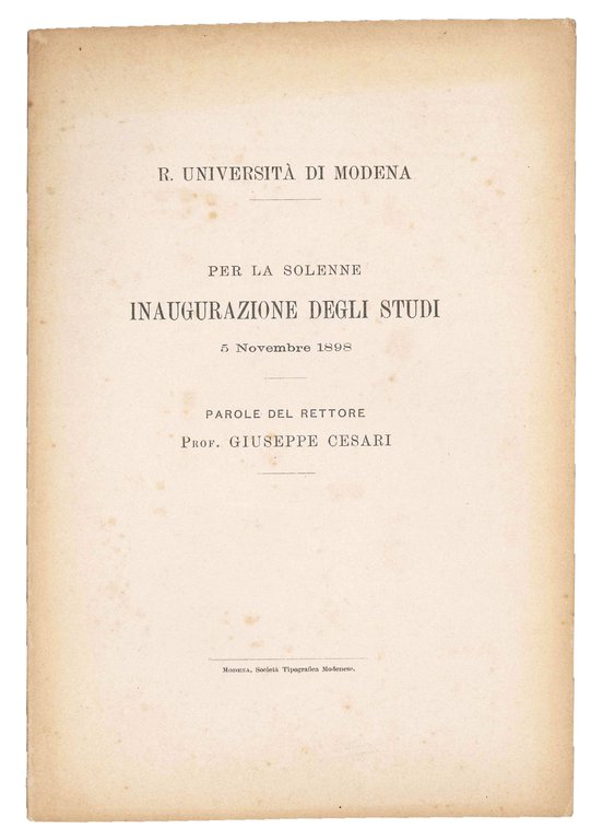 Mm. 248x170. Pp. 18. Opuscolo editoriale con titolo alla cop. ant. (cop. marginalmente brunita, fioriture occasionali). Estratto da Annuario della R. Universita di Modena, a. s. 1898-99.