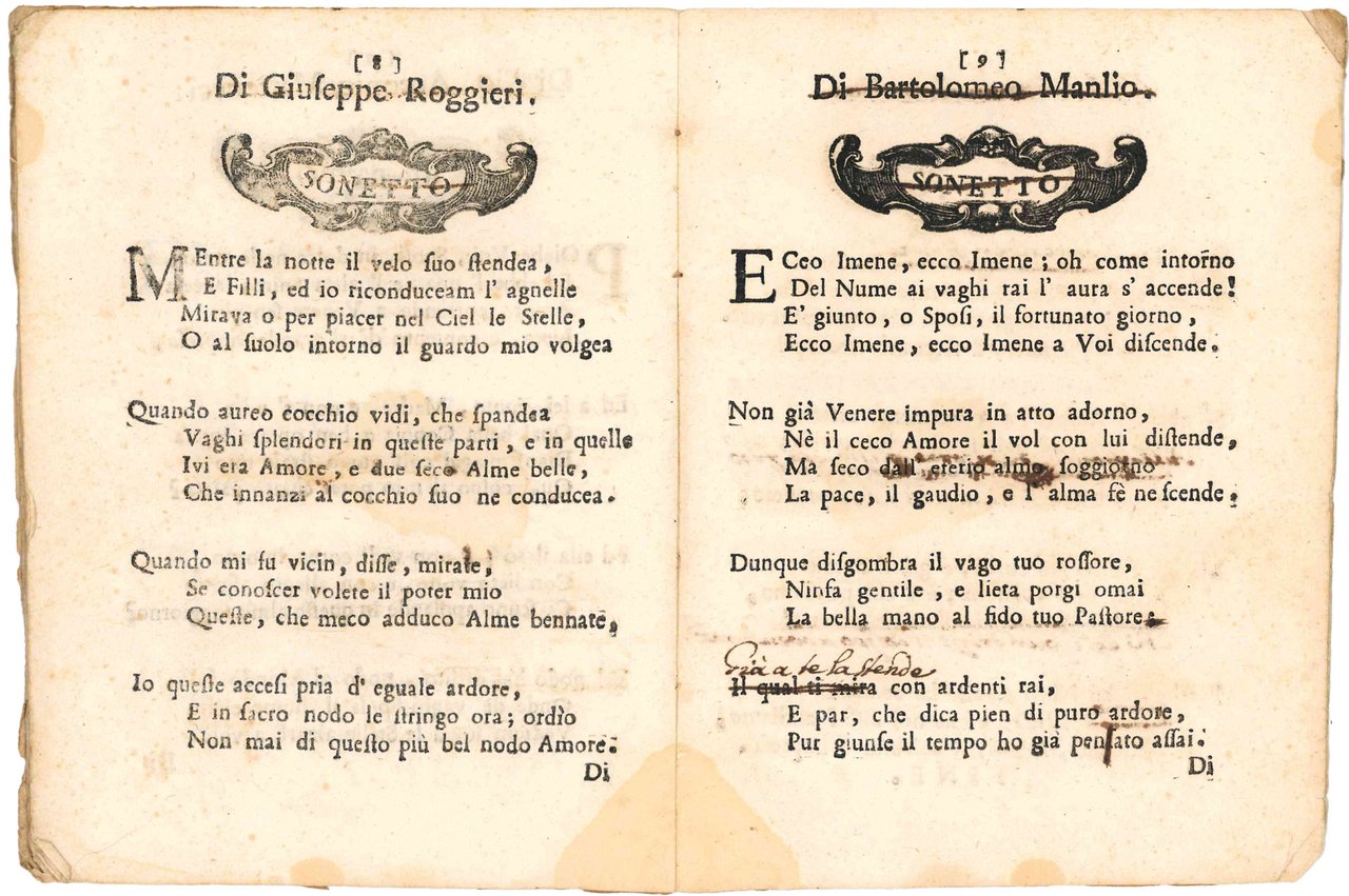 In 8vo (mm. 187x140). Pp. 11, [1 bianca]. La raccolta di sonetti di tema amoroso ed epitalamico di autori vari: Cesare Bulgarini, Vincenzo Pangrazi, Giuseppe Fassitelli, Tommaso Panurghi, Antonio Matteucci, Giuseppe Roggieri, Bartolomeo e Michele Manlio. I sonetti seontti del Manlio (pp. 9/10) presentano interessanti correzioni manoscritte coeve. Frontespizio con xilografia di un putto e motivi decorativi. Brossura coeva (leggermente brunita e con alcune macchie). Leggere fioriture e lievi aloni.