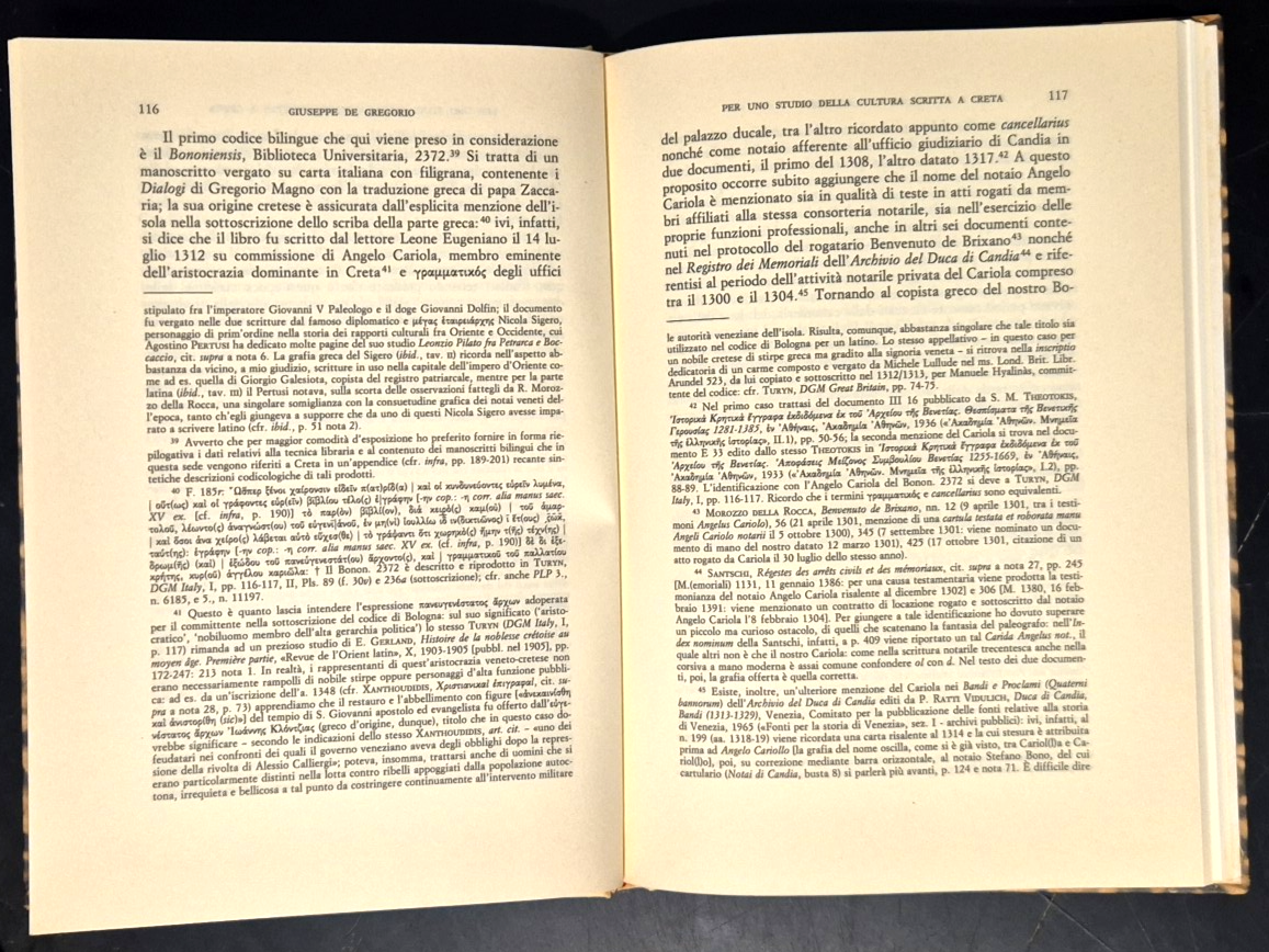 PER UNO STUDIO DELLA CULTURA SCRITTA A CRETA SOTTO IL DOMINIO VENEZIANO: I CODICI GRECO LATINI DEL SECOLO XIV di Giuseppe De Gregorio.