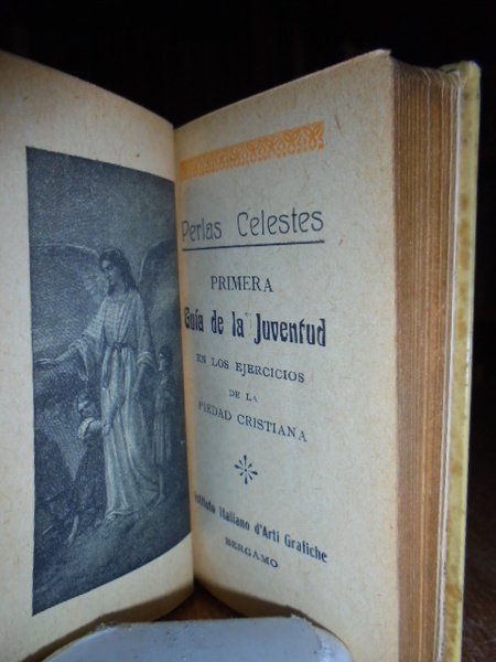 (Religione). Bergamo, Istituto Italiano d' Arti Grafiche, s.d. (circa 1910). PERLAS CELESTES. Primera guia de la Juventad el los ejercicios de la Pietad Cristiana. In - 24° (cm.11),piena pergamena edit. con impressioni a secco, taglio dorato. 190 pp. con una tavola in antiporta raffigurante un Angelo insieme a un bambino e a una bambina. Graziosa edizione, esemplare perfetto. Neg. Mob. 5