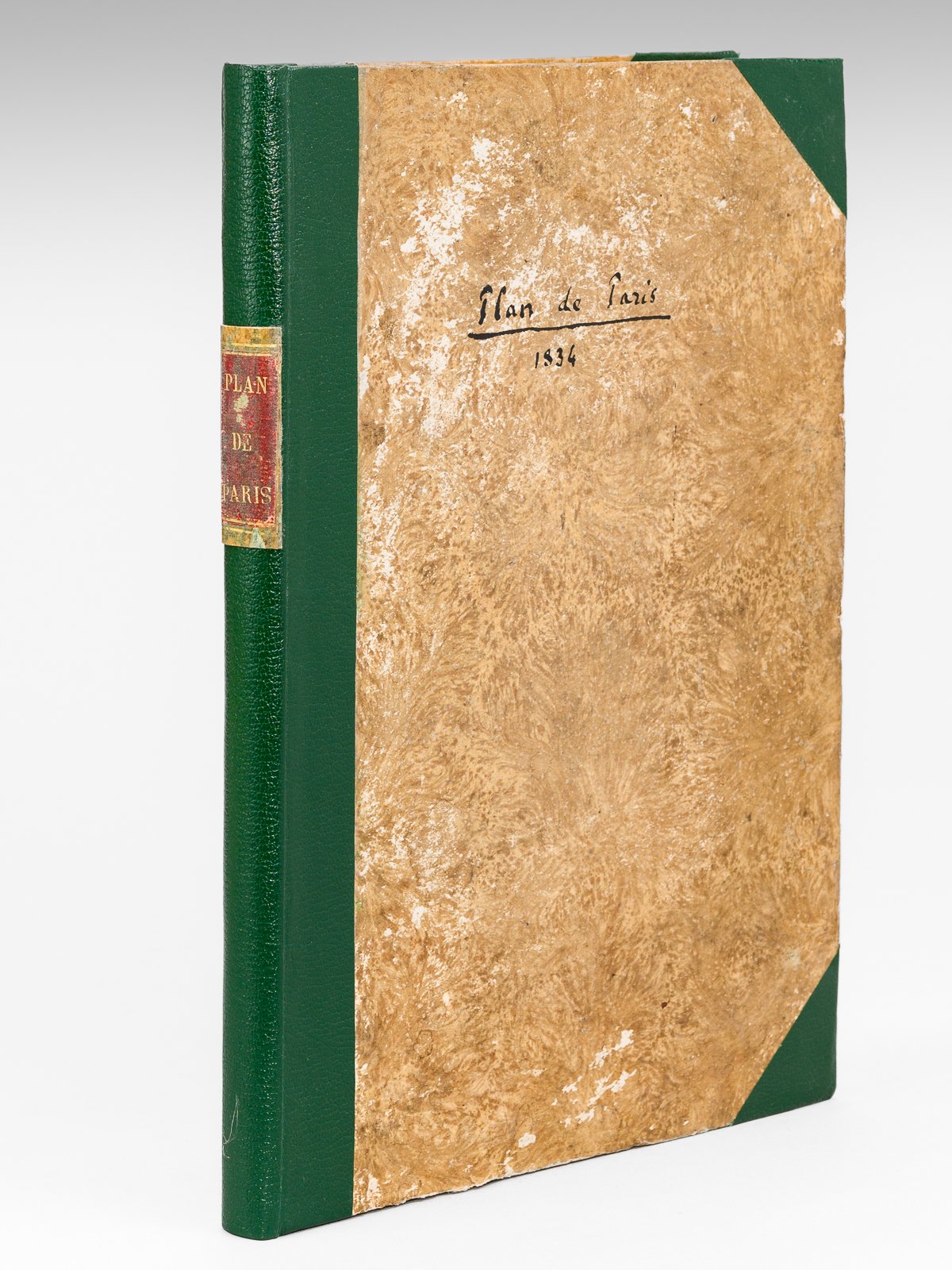 1 vol. in-4 cartonnage éditeur avec restauration en simili demi-maroquin à coins vert, Chez E. Garnot, Paris, 1834, 3 ff., XVIII pp. et 48 planches doubles en couleurs Ce charmant atlas nous plonge dans un Paris qui avait encore conservé beaucoup de son aspect ancien et le réseau compliqué de ses rues pittoresques. On y trouvera notamment la trace, pour les quartiers du centre, d'une Cité intacte avec ses vieilles rues et la forme de ses enclos médiévaux. Une jolie vignette représentant un monument orne chacune des 48 planches. Etat très satisfaisant (coins et dos restaurés, sans le plan récapitulatif, l'atlas a été anciennement paginé et numéroté à la plume, qq. traces d'usages) pour cet exemplaire provenant de la bibliothèque d'Alidor Delzant, qui fut secrétaire et exécuteur testamentaire des Goncourt et de Paul de Saint-Victor, avec sa signature et la mention autographe : "Biblioth. de Parays (Lot et Garonne) 7bre 1900".