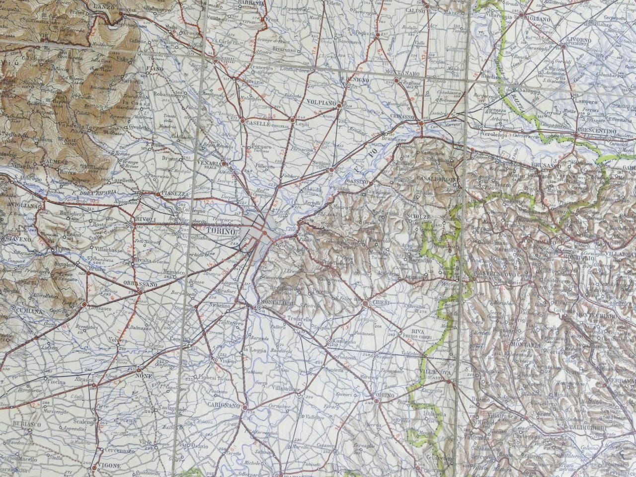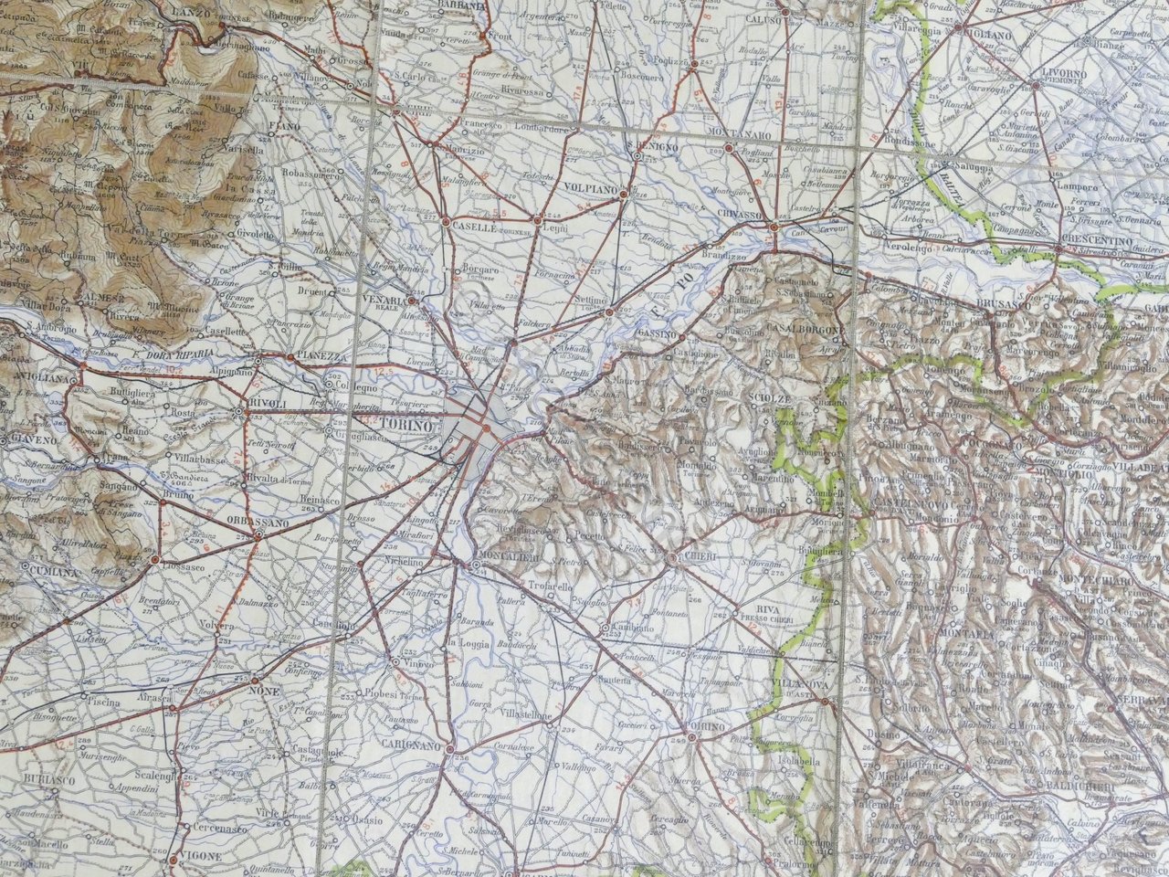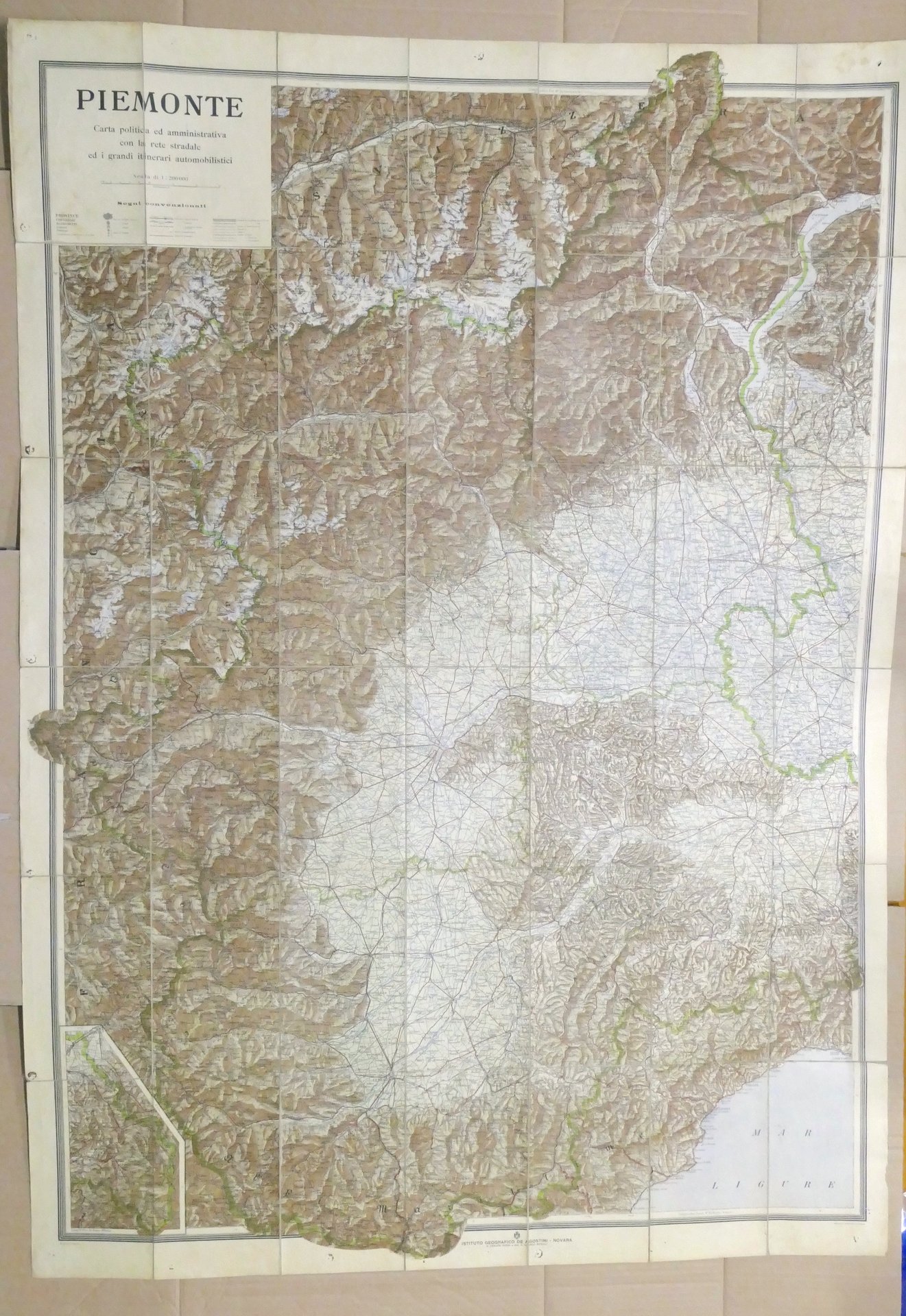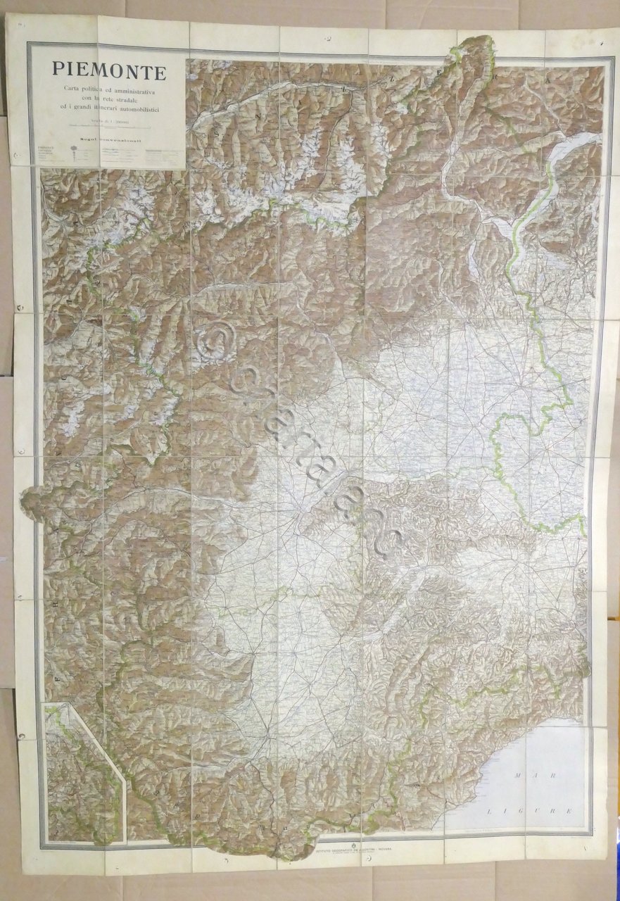 Piemonte - Carta politica amministrativa con rete stradale ed i grandi itinerari automobilistici - Istituto Geografico De Agostini Novara - Primo Novecento 42 pannelli cartacei applicati su tela. Dimensioni: 137 x 99 cm ca. Condizioni molto buone. Piccoli segni del tempo.