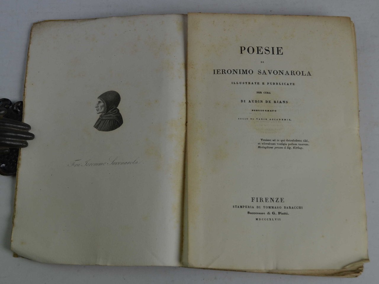 Cm. 21,5, pp. (4) xxviii, 50 (4) 53 (27). Con ritratti f.t. di Savonarola all'antiporta ed uno di Lorenzo de Medici. Bross. orig. ornata. Ben conservato. Si tratta di uno degli esemplari stampati su carta distinta.