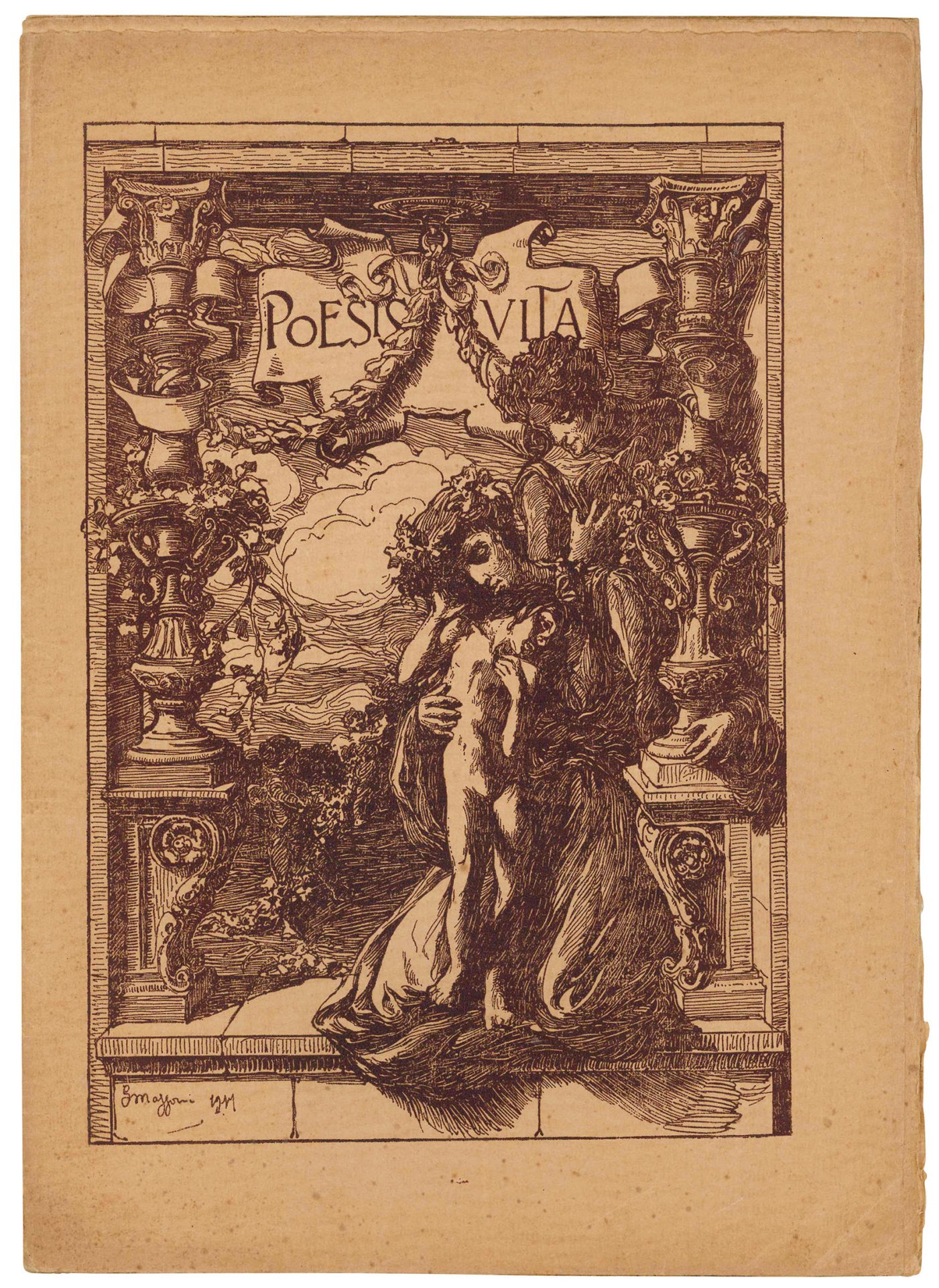 Mm. 353x252; cc. [8], con tre belle xilografie in nero a piena pagina di Giuseppe Mazzoni (Primavera, Giovinezza, Maternità). Bella carta pesante. Brossura editorale illustrata da Giuseppe Mazzoni in sanguigna (Poesis Vita). Edizione stampata in 120 esemplari numerati (copia n. 95). Ottimo esemplare.