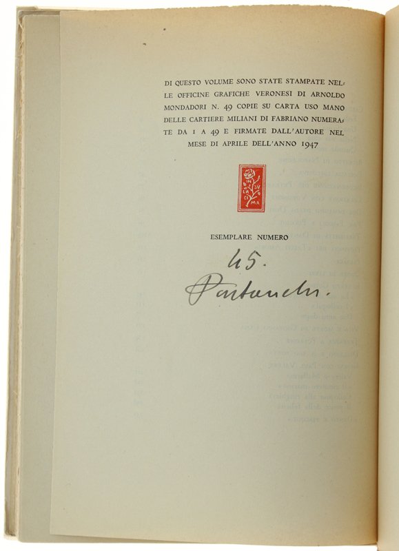 (Codice LN/0084) In 8° (23,5 cm) 263 pp. Edizione originale, di 49 esemplari su carta uso mano delle cartiere Miliani di Fabriano, numerati e firmati dall'Autore (esemplare n. 45). Inoltre dedica autografa dell'autore (una pagina manoscritta). Con 2 tavole fuori testo. Brossura originale, sovraccoperta trasparente ingiallita. Volume ottimo. ~~~ SPEDIZIONE IN ITALIA SEMPRE TRACCIATA
