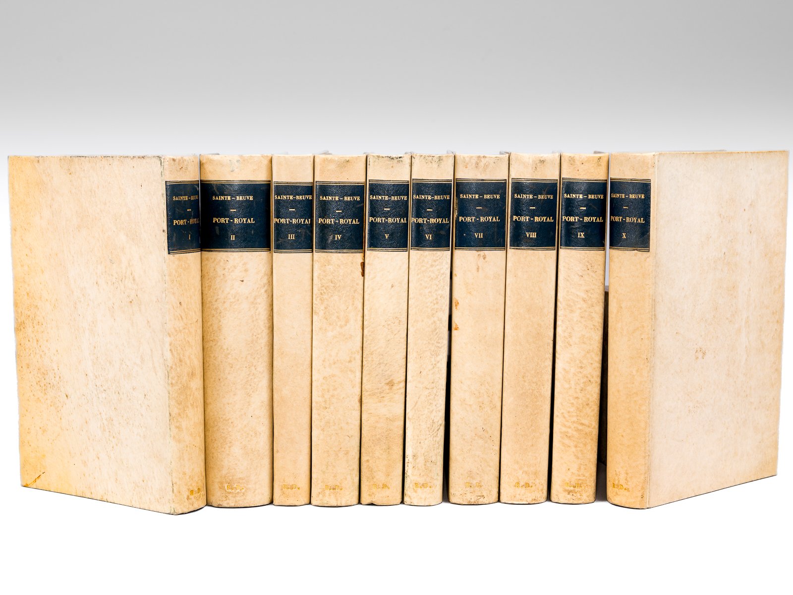 Un des 100 exemplaires sur vélin teinté d'Annam de Blanchet & Kléber (après 25 Rives), numéro 77, 10 vol. grand in-8 reliure de l'époque plein vélin blanc, couvertures conservées, initiales R.D. au dos en queue, La Connaissance, Paris, 1926 Exemplaire sur beau vélin teinté de cette importante édition critique, enrichissant le chef-d'oeuvre de Sainte-Beuve de nombreuses notes et commentaires, ainsi que de nombreuses gravures hors texte. Etat très satisfaisant (reliures un peu frottées avec très rares annotations au crayon, bon état par ailleurs) pour cette édition de référence.