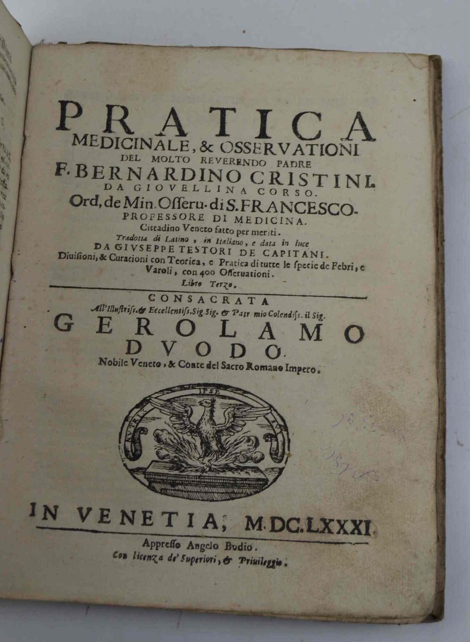 Pratica medicinale, & osserVationi del molto reuerendo padre F. Bernardino Christini... tradotta di latino, in italiano, e data in luce da Giuseppe Testori de Capitani. Divisa in tre libri... | Libri antichi e moderni | CRISTINI BERNARDINO.