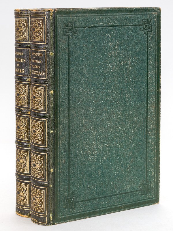Illustrés d'après les dessins de l'auteur, d'un grand nombre de vignettes dans le texte et de 48 et 54 grandes gravures hors texte, par MM. Calame, Girardet, Français, d'Aubigny, etc., Septième et Quatrième éditions, 2 vol. in-4 reliures uniformes de l'époque demi-chagrin vert, dos à 5 nerfs orné (caissons), toutes tranches dorées, rel. signée Ch. Magnier, Garnier frères, 1878 et 1877, 474 et 454 pp. Agréable exemplaire de bonne fraîcheur (rares rouss. et lég. frott. en dos) réunissant les "Premiers voyages" et les "Nouveaux Voyages". Complet des planches. On ne présente plus le récit pittoresque de Töpffer, si vivant, plein d'entrain et d'esprit. les premiers voyages illustrés de merveilleuse manière nous font souvent dépasser les frontières de la Suisse pour nous conduire de Chamounix (Chamonix) ou Milan, jusqu'à Vérone et Venise. Le second volume nous offre quatre merveilleux itinéraires sous la conduite du plus charmant et du plus spirituel des guides. Le quatrième voyage, à Gênes, nous conduit par Annecy, Saint-Jean de Maurienne, Modane, Suse, Rivoli et Turin, pour s'en revenir par La Corniche, Monaco, Nice, Nice, Antibes, Grasse, Sisteron, Gap et Grenoble.