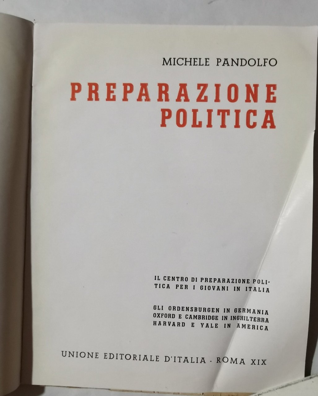 Preparazione politica - Il centro di preparazione politica per i giovani in Italia - gli Ordensburgen in Germania - Oxford e cambridge in Inghilterra Harvard e Yale in America | Libri antichi e moderni | Pandolfo , Michele