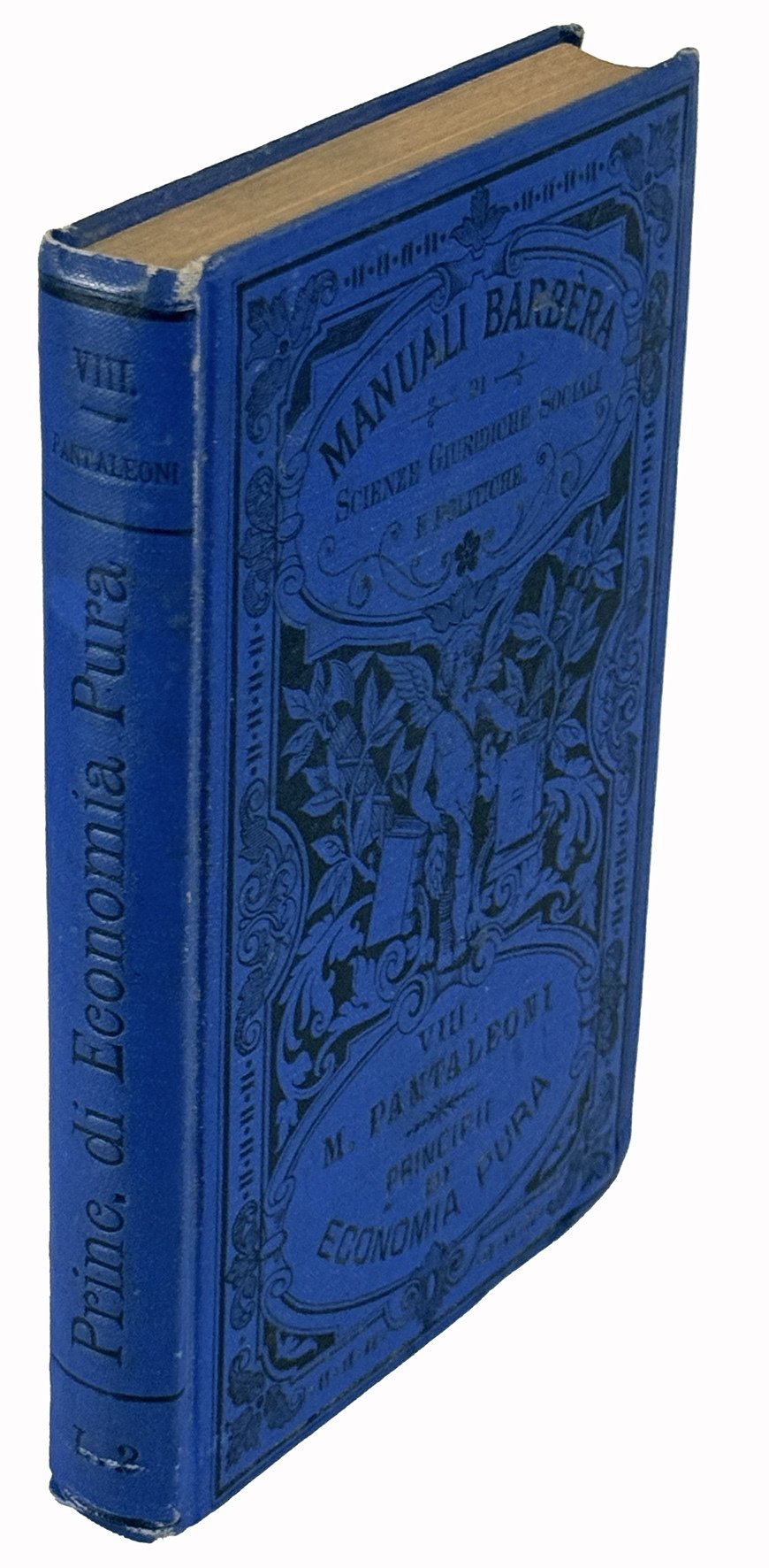 “Pantaleoni was born in Frascati, near Rome. After initial studies in Paris and in Germany - he was a son of a diplomat - he graduated in Law in 1880 at the University of Rome, with a thesis published in 1882 under the title of Teoria della traslazione dei tributi. He began to teach at the University of Camerino in 1881 and then moved to Macerata, Venice, Bari, Geneva, Pavia and finally to Rome, from 1902, where he lectured on political economy until his death in 1924. Vilfredo Pareto and Enrico Barone were both initiated to the study of economics by him. In 1890 Pantaleoni, together with Antonio De Viti de Marco and Ugo Mazzola, acquired the ‘Giornale degli Economisti', with the purpose of transforming it into the voice of the marginalist school, indicating a new direction for the Italian school of economics. He was at the time engaged in politics; and was elected as a Radical to the Italian Parliament in 1900, but resigned shortly afterwards. He supported the emerging fascism, and was nominated a member of the Italian Senate in 1923 […] Pantaleoni was particularly appreciated in England; his Principii di Economia pura (1889) was translated into English in 1898. His obituary written by Piero Sraffa in 1924 appeared in the ‘Economic Journal', edited by John Maynard Keynes and his master Francis Ysidro Edgeworth. Saffa defined Pantaleoni as the ‘prince' of Italian economists, and praised him not only as an economist, but also as a teacher: ‘The work of Pantaleoni as a thinker and writer, however, is equalled, if not surpassed, in the opinions of those who have been so fortunate as to be in personal contact with him, by his work as a teacher. To this he devoted all his enthusiasm and ardour; it was in this that he took most pride […] Italian economist are few indeed who are not in some measure his disciples' ” (M. Palumbo-E. Sidoli, eds., Books that made Europe, Brussels, 2016, p. 258).