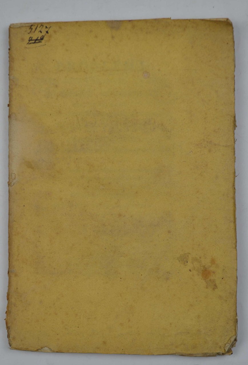 Cm. 21,5, pp. 98. legatura coeva in cartoncino giallo. Esemplare genuino e ben conservato, pulito ed in barbe. Opera comune, ma piuttosto interessante.