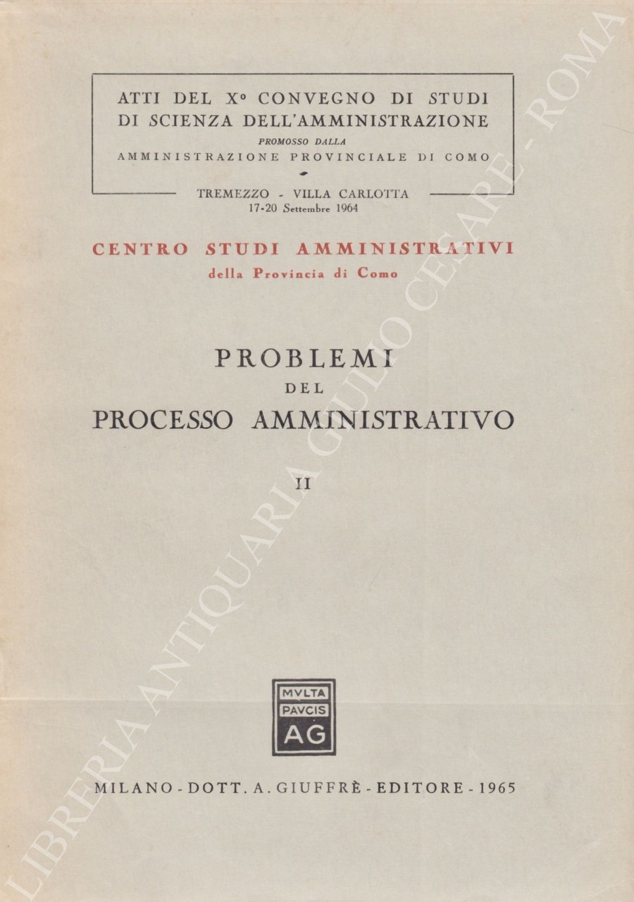 Problemi del processo amministrativo. Atti del X Convegno di Studi di Scienza dell'Amministrazione promosso dalla Amministrazione Provinciale di Como. Tremezzo - Villa Carlotta 17-20 Settembre 1964 | Libri antichi e moderni | Aquarone L. - Alessi R. - Allorio E. - Bachelet V. - Bassi F. -, Capaccioli E. - Cheli E. - Fazzalari E. - Furno C. - Giannini M., S. - Guicciardi E. - Jaeger N. - Ledda F. - Lucifredi R. - Miele, G. - Piras A. - Pototschnig U. - Romano Salvatore - Virga P. Et, Alii