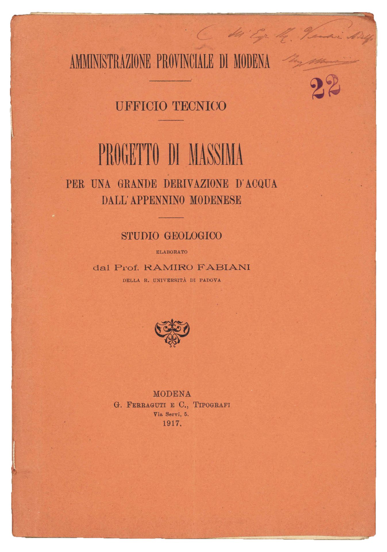 Mm. 277x194. Pp. 31, V cc. di tavv. f.t. di: sezioni del progetto, valli dell'Ospitale e del Fellicarolo, Valle dello Scoltenna e monte della Penna. Brossura editoriale con titolo alla cop. ant. (firma di possesso al margine sup. della cop. ant.). Ottimo esemplare.Prima rara edizione, nessun esemplare censito in ICCU, di questo studio di ingegneria idraulica del geologo, paleontologo e professore universitario italiano, socio dell'Accademia nazionale delle scienze originario di Barabrano Vicentino, Ramiro Fabiani. L'opera riguarda interventi idraulici da effettuarsi sul Torrente Ospitale dal Ponte Nuovo a Molino Damiani, la Valle di Felicarolo ad oriente di Canevare, la costruzione di una galleria attraverso il Monte Lancio fino alla derivazione del Fellicarolo, lungo la valle dello Scoltenna da Pievepelago fino a Riolunato, la costruzione di una galleria attraverso il monte della Penna cioè fra il versante dello Scoltenna e la Valle del Vesale ed, infine, una galleria attraverso il Monte Emiliano. Lo studio analizza la situazione idrogeologica del territorio.
