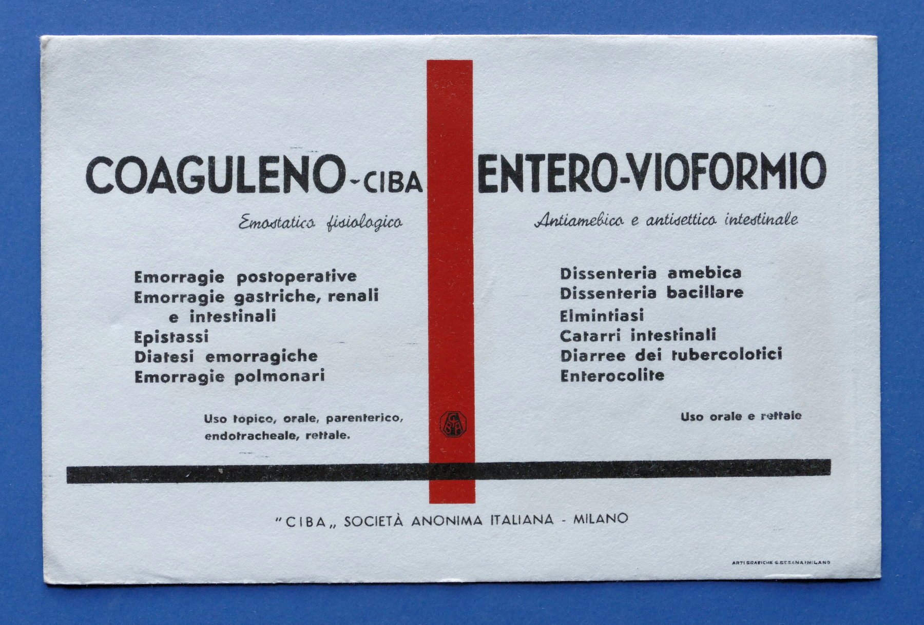 Pubblicità d'epoca Farmaceutica Carta Assorbente - Coaguleno - Entero-Vioformio - Società Ciba Dimensioni: 14,5 x 22 cm ca. Condizioni buone.